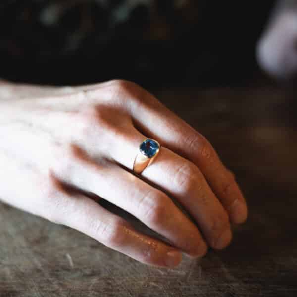 Chevalière en or jaune 18 carats et spinelle bleue – Années 1960