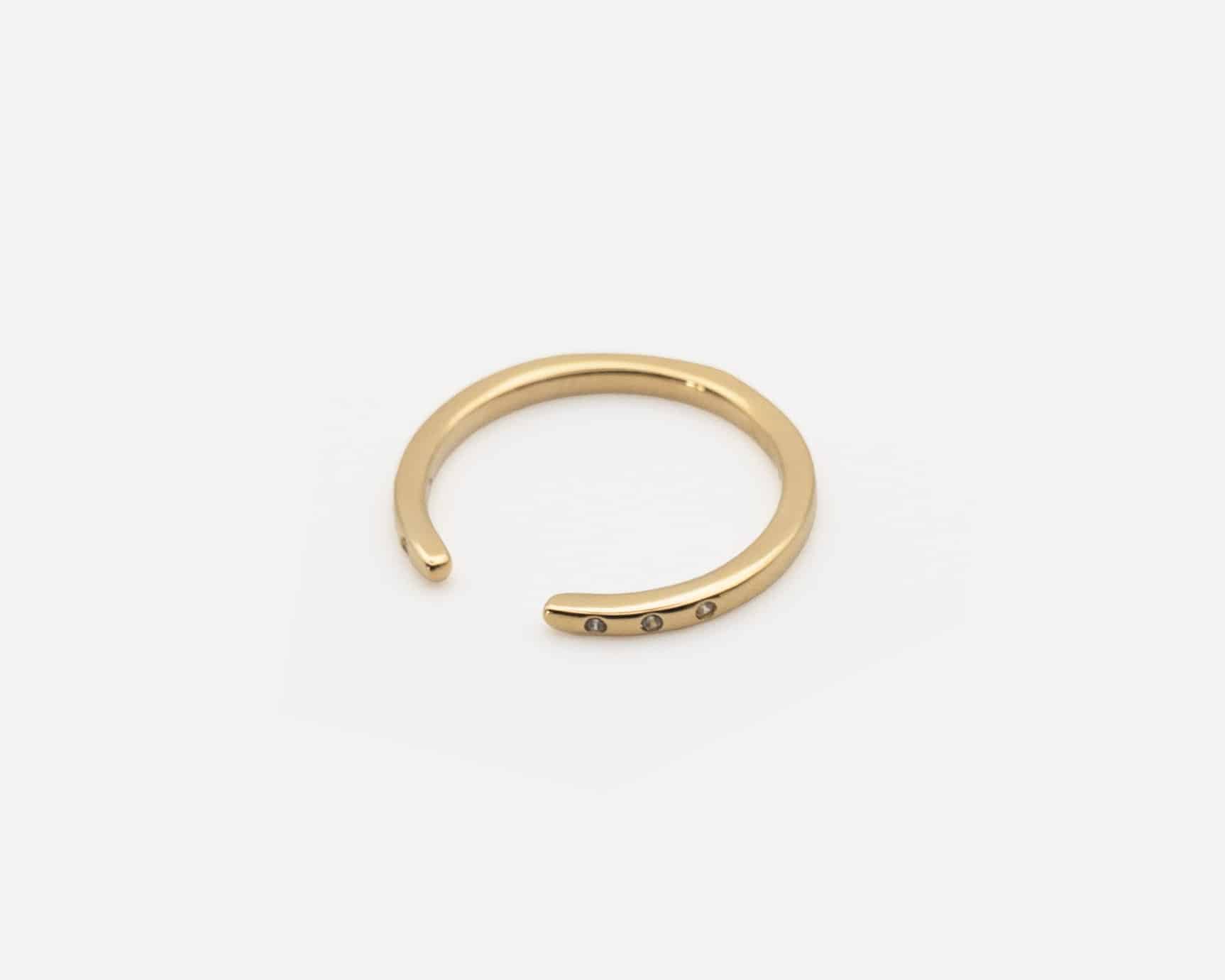 Avec son design épuré et son ouverture délicate, la bague Joséphine apporte une touche de modernité et de raffinement. Son anneau en plaqué or 18 carats est sublimé par trois oxydes de zirconium facettés, sertis avec précision pour capter la lumière à chaque mouvement.