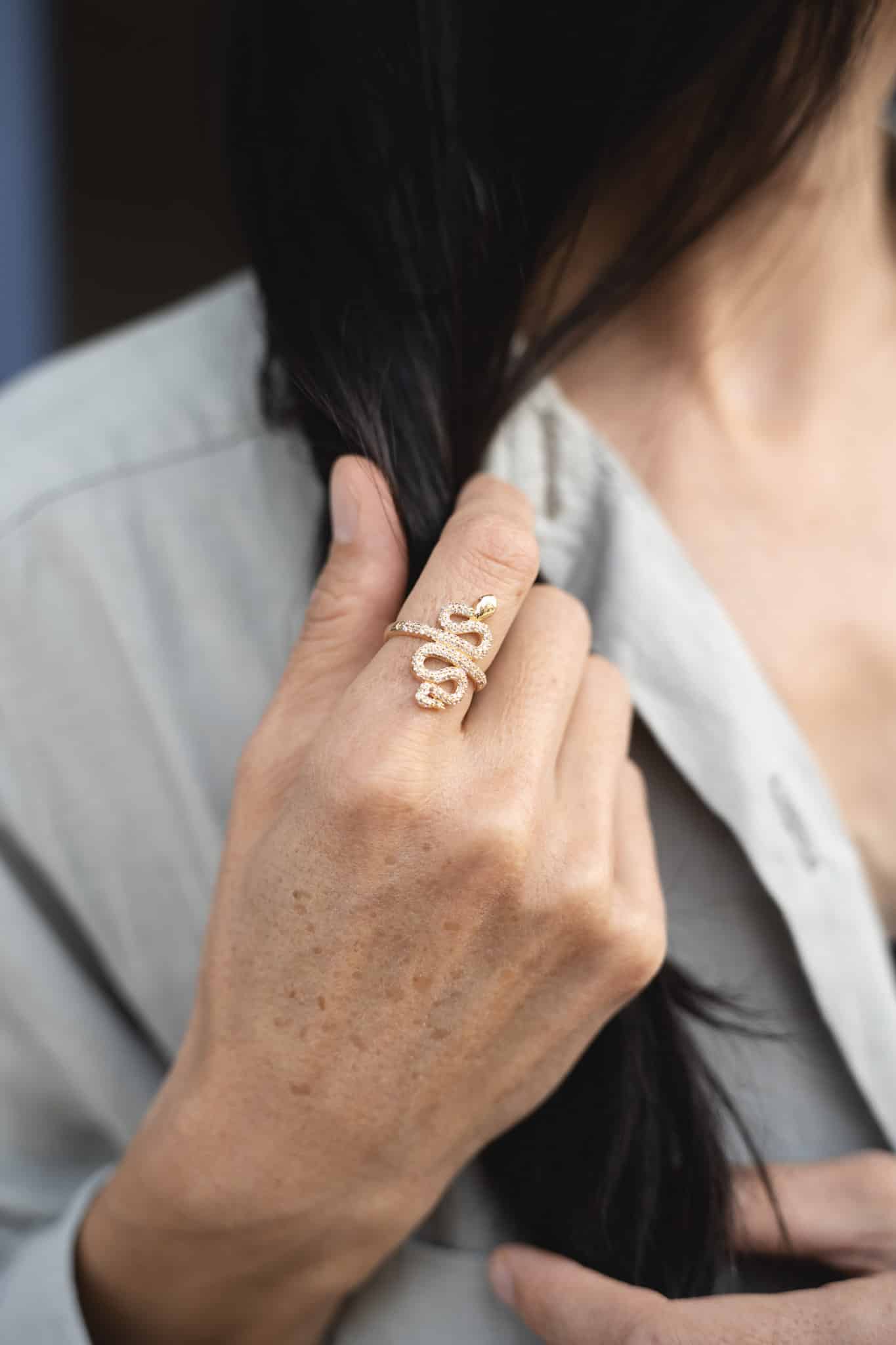 La bague Nagar incarne puissance et mystère avec son design serpent enroulé, symbole intemporel de transformation et d’éternité. Son anneau en plaqué or 18 carats, finement travaillé, épouse délicatement le doigt, tandis que ses pierres scintillantes soulignent chaque détail du motif, apportant une brillance hypnotique.