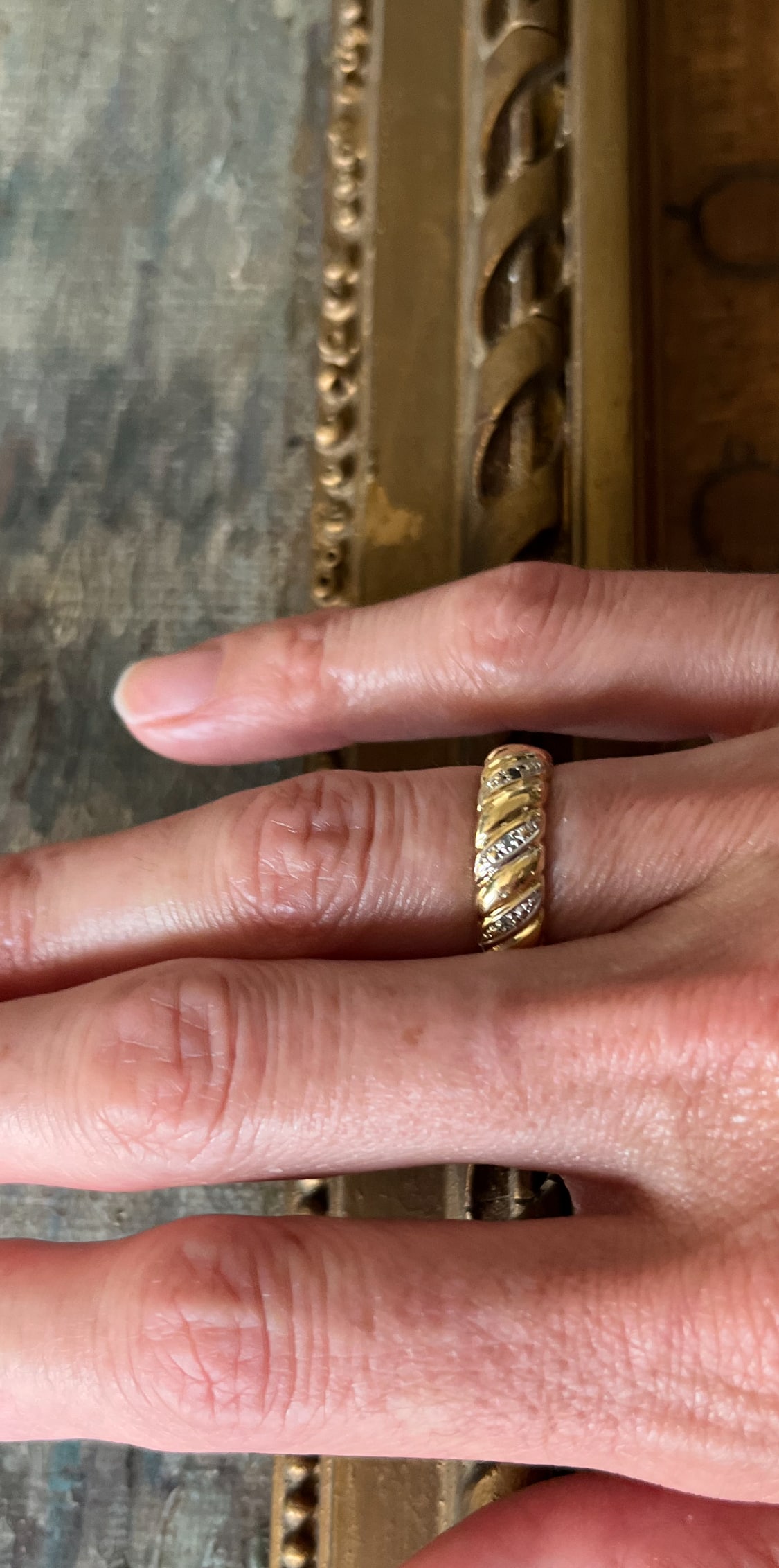 De petits diamants taille simple, d’un poids total d’environ 0,02 carat, ponctuent la surface du bijou et soulignent son relief.