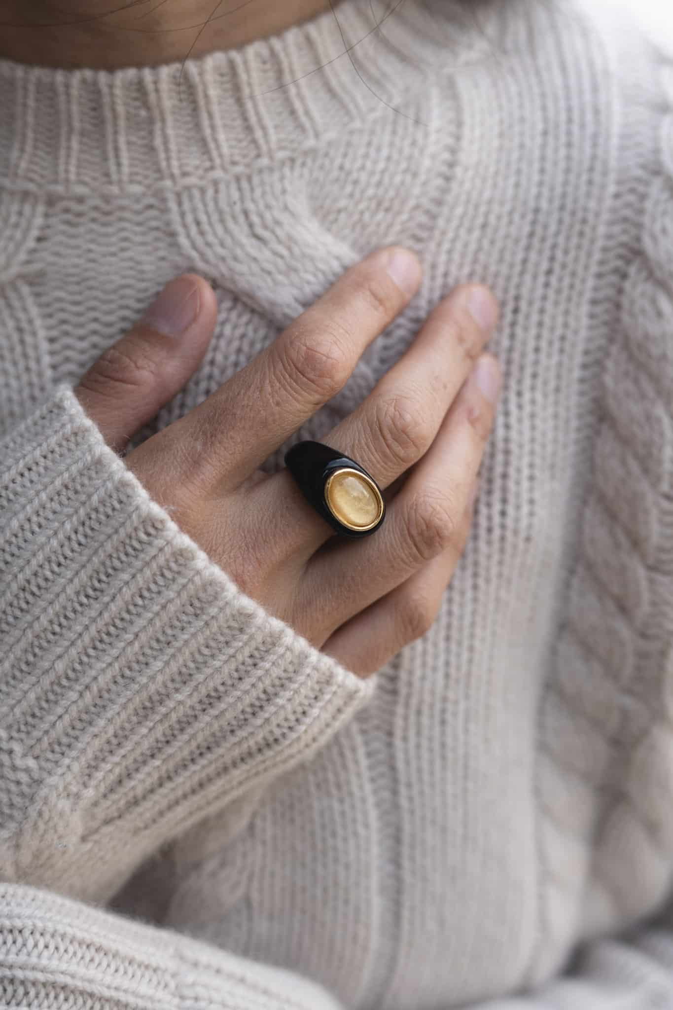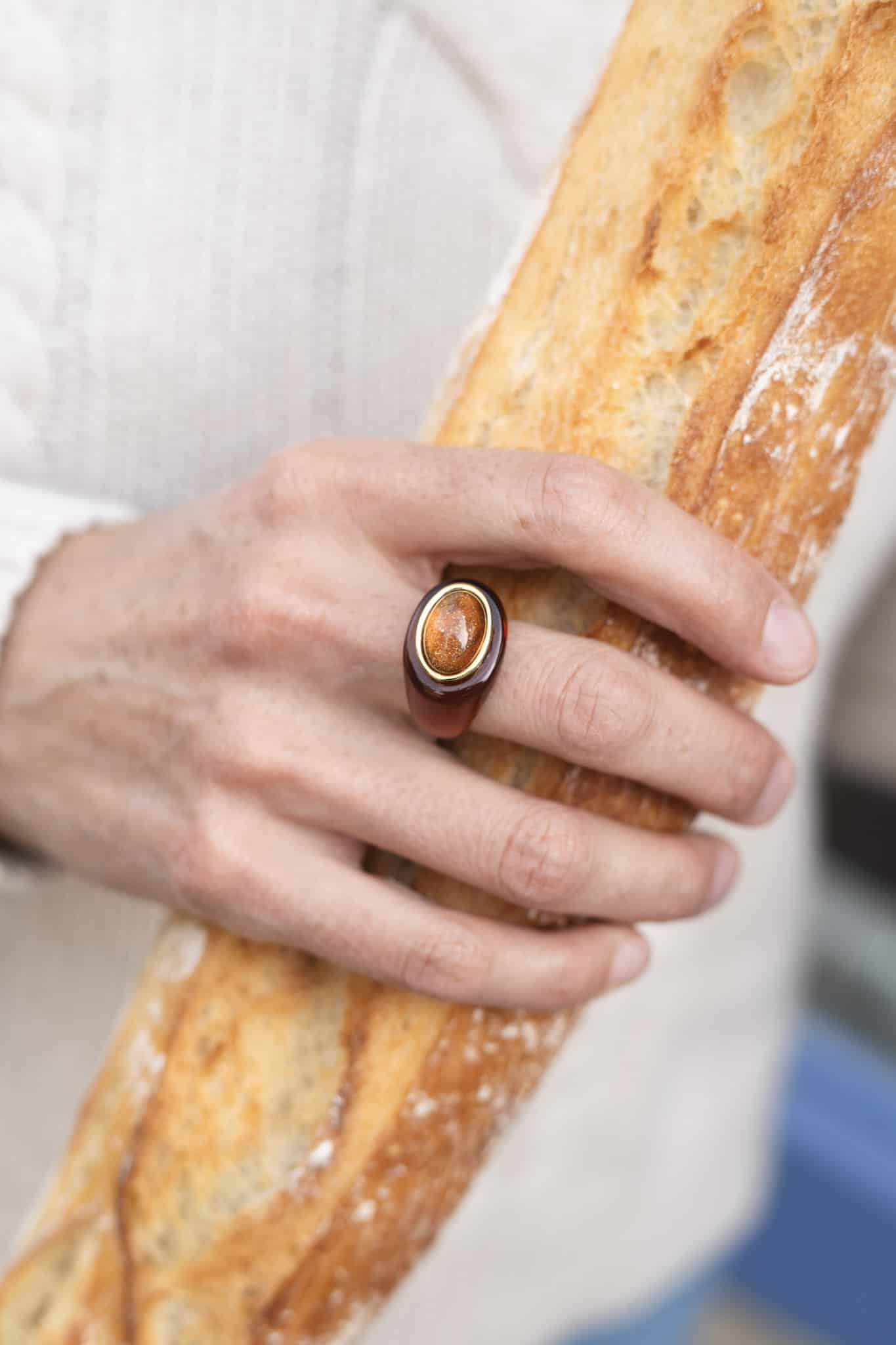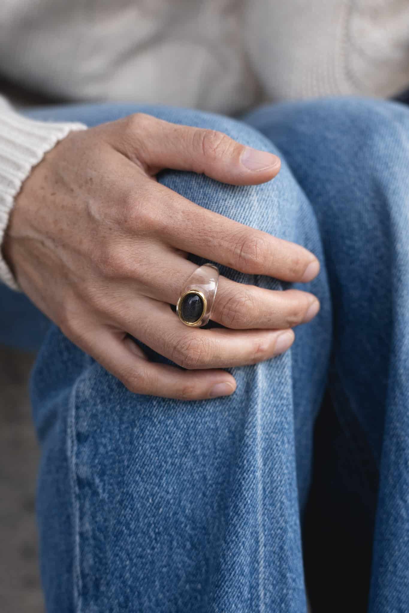Cette bague en résine arbore un design épuré et graphique. Sa forme bombée et sa finition lisse lui donnent un aspect sculptural, facile à porter au quotidien. Elle est disponible en quatre coloris : noir profond, crème douce, transparent cristallin et ambré lumineux.