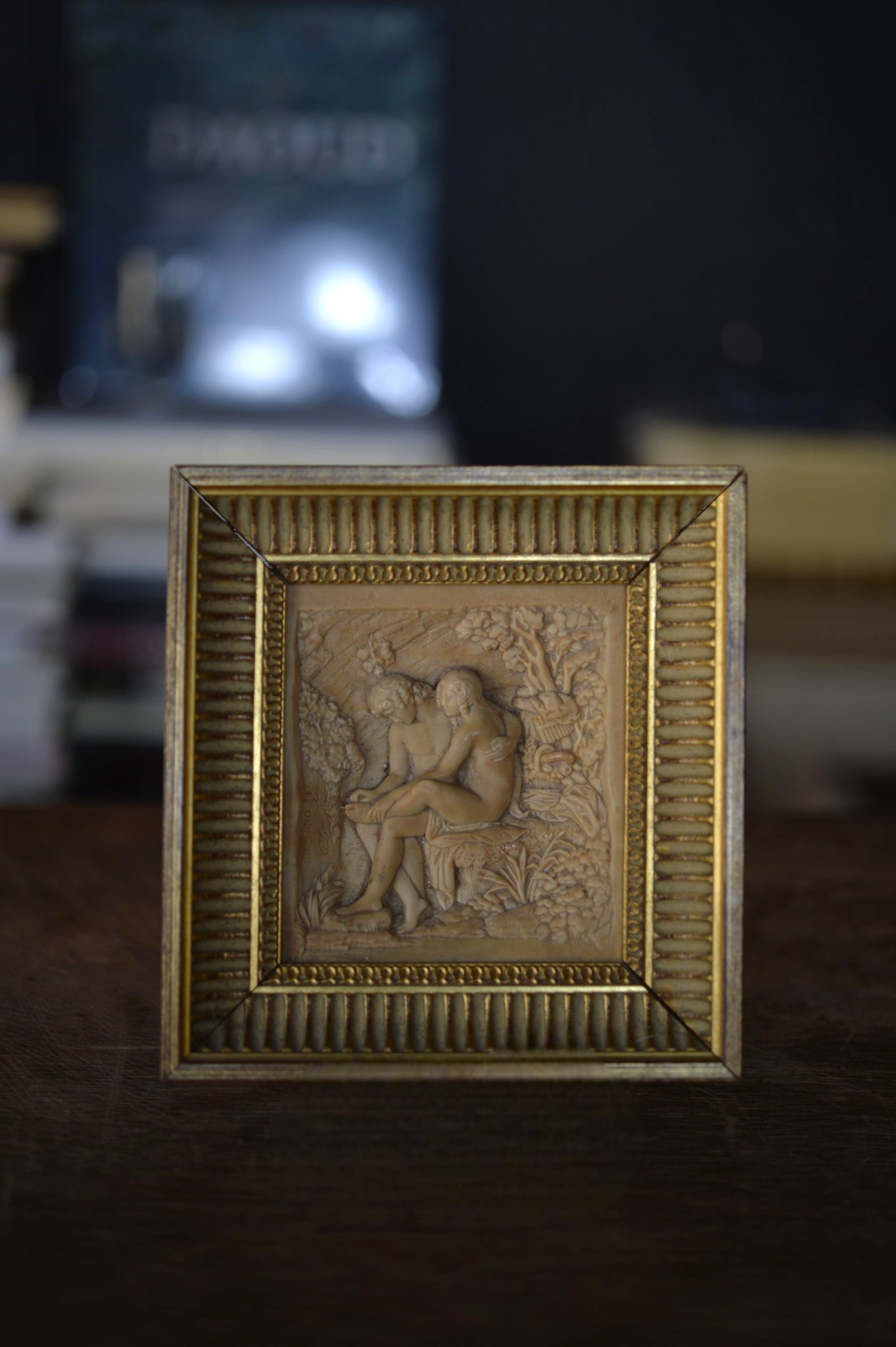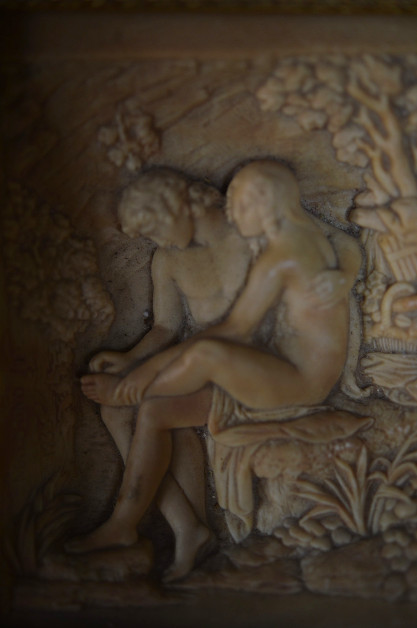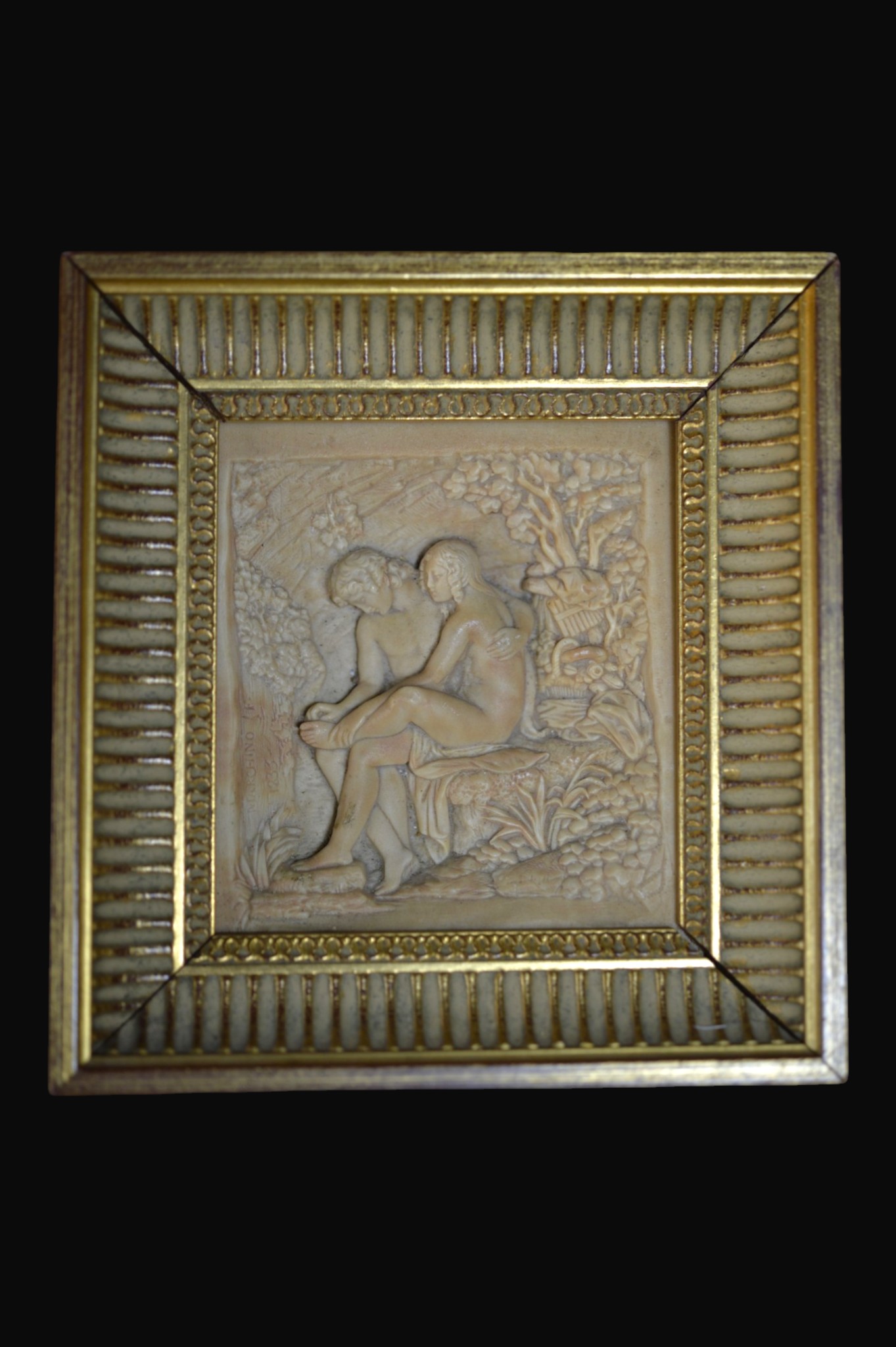 Charmant bas-relief en plâtre représentant un couple nu enlacé dans un décor végétal stylisé.