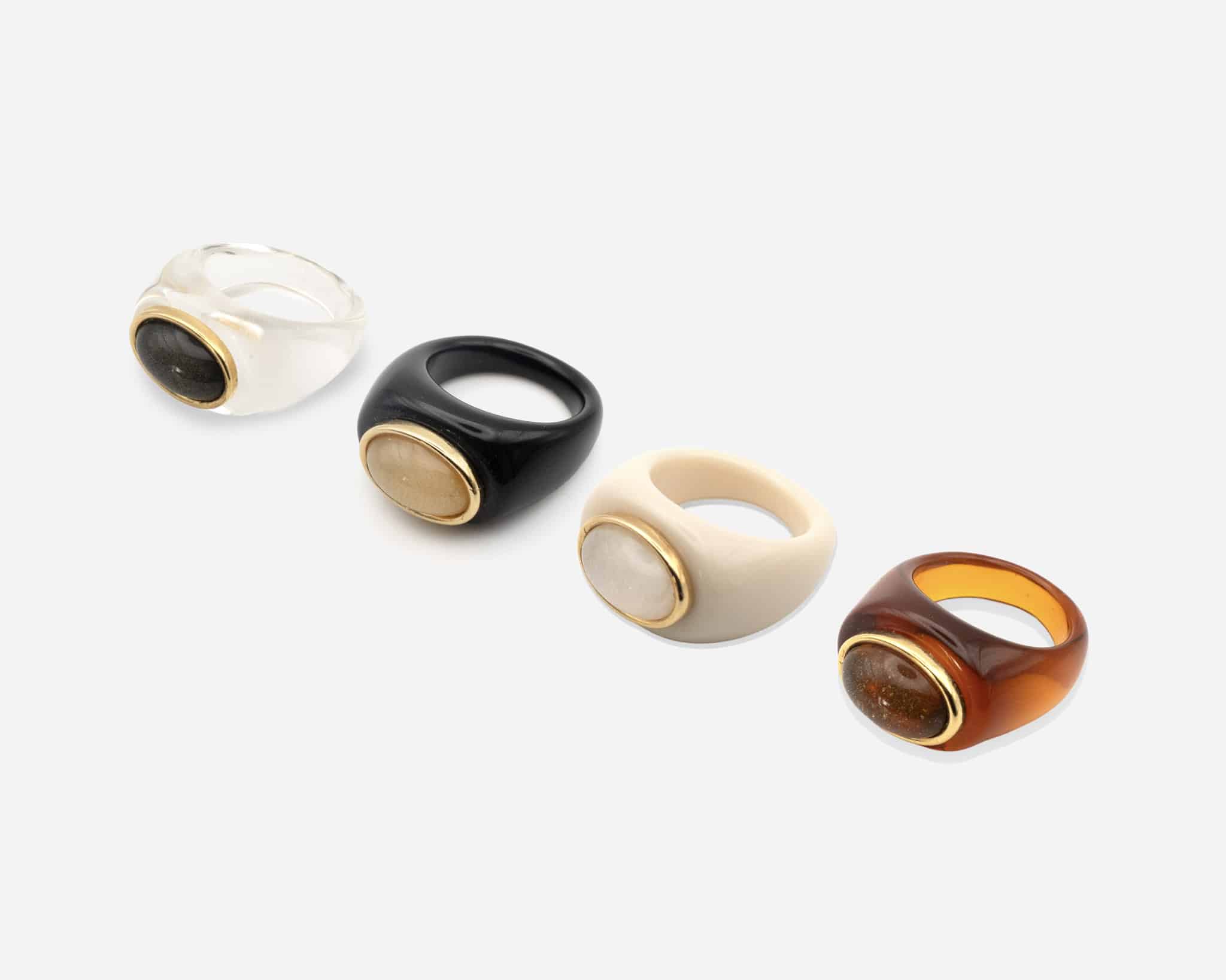 La pierre, aux reflets métalliques anthracite, repose dans une monture lisse et épurée, aux épaules légèrement galbées et finement polies.