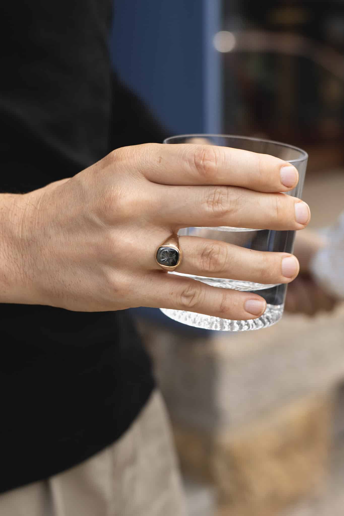 La bague est ornée d’une intaille en hématite cabochon, taillée en forme de coussin et gravée d’un centurion romain, symbole de force et de discipline.