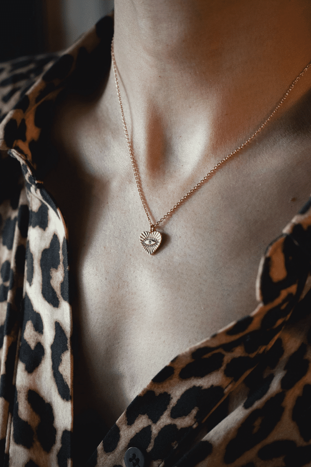 Éclat mystique et douceur dorée : ce collier en plaqué or 18 carats révèle un pendentif en forme de cœur rayonnant, orné en son centre d’un œil protecteur serti de zircons étincelants.
