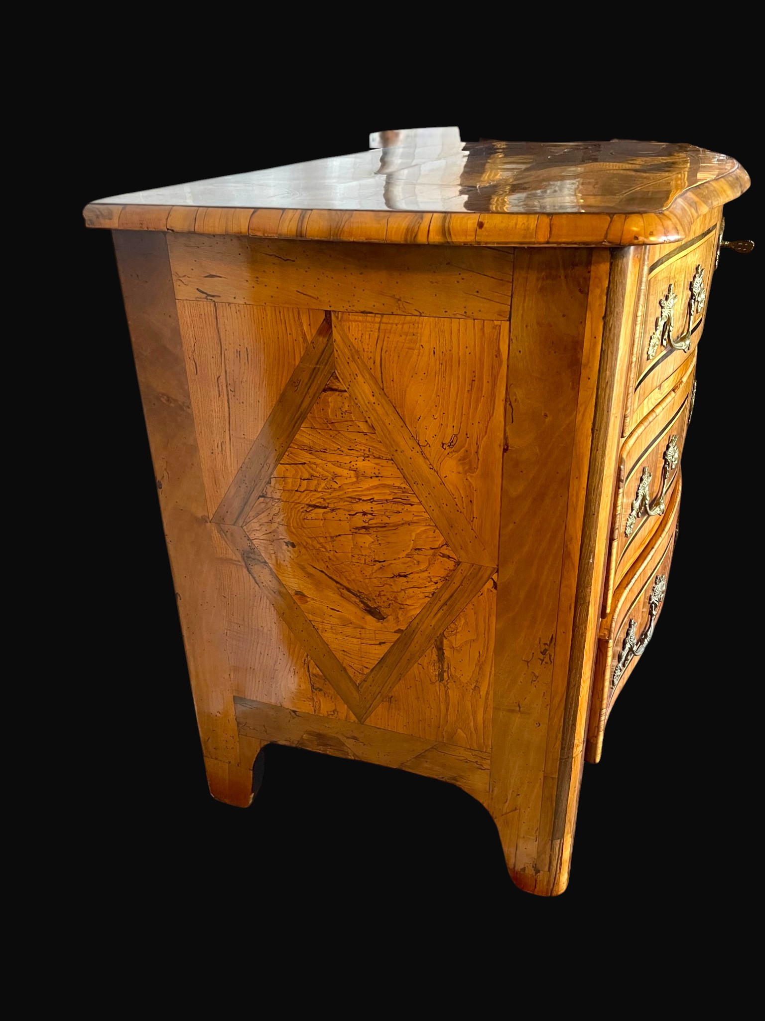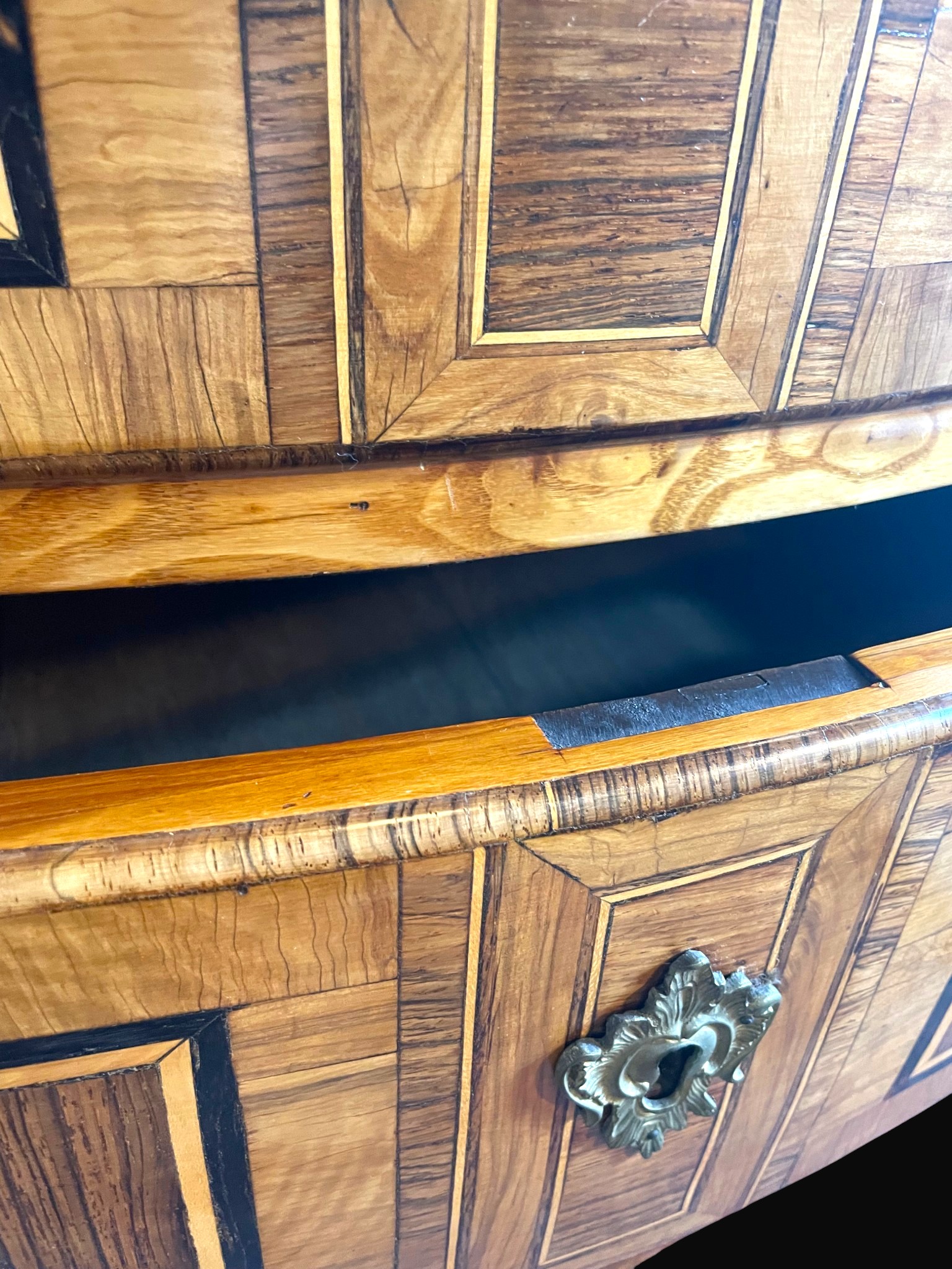 La façade ouvre par trois tiroirs. Elle se distingue par la qualité de son exécution, notamment par les retours de placage sur les tiroirs, signe d’un travail particulièrement soigné.