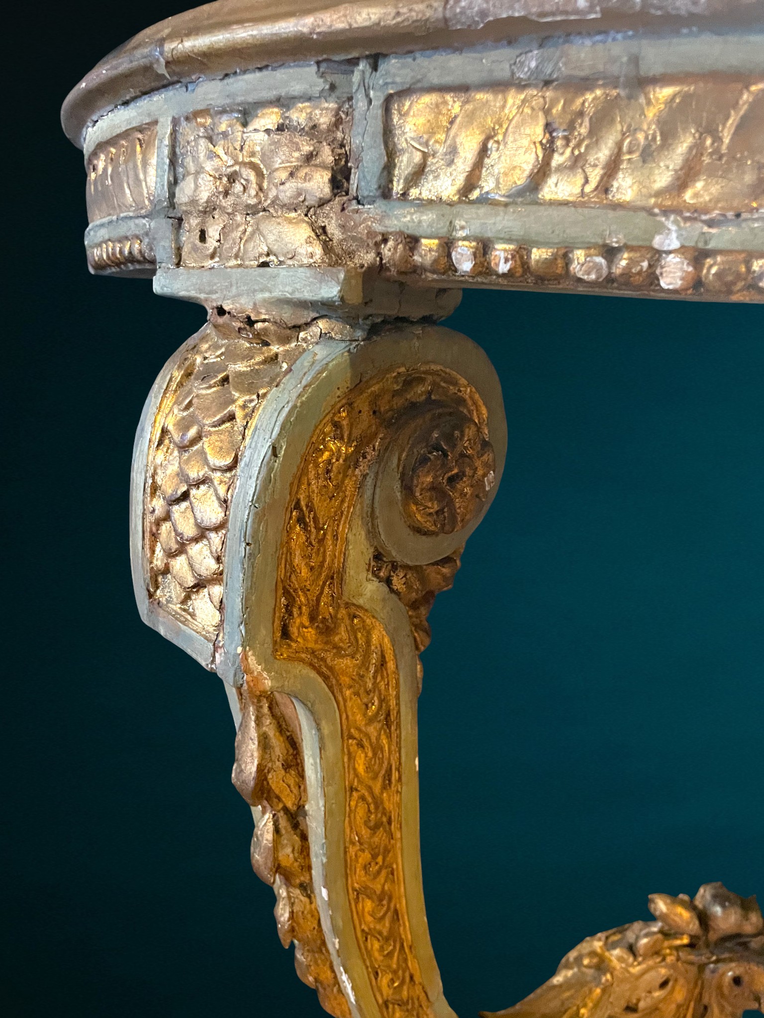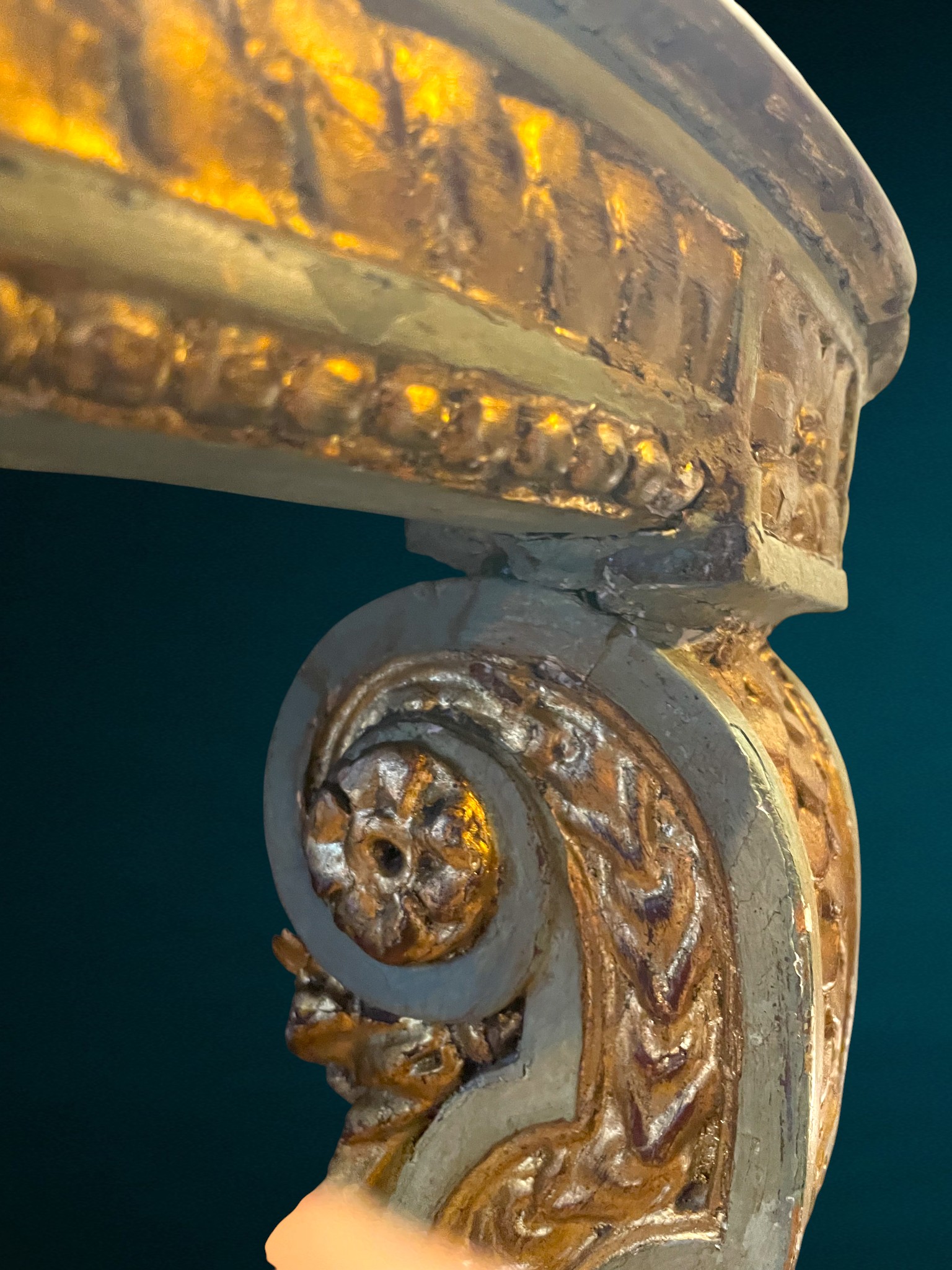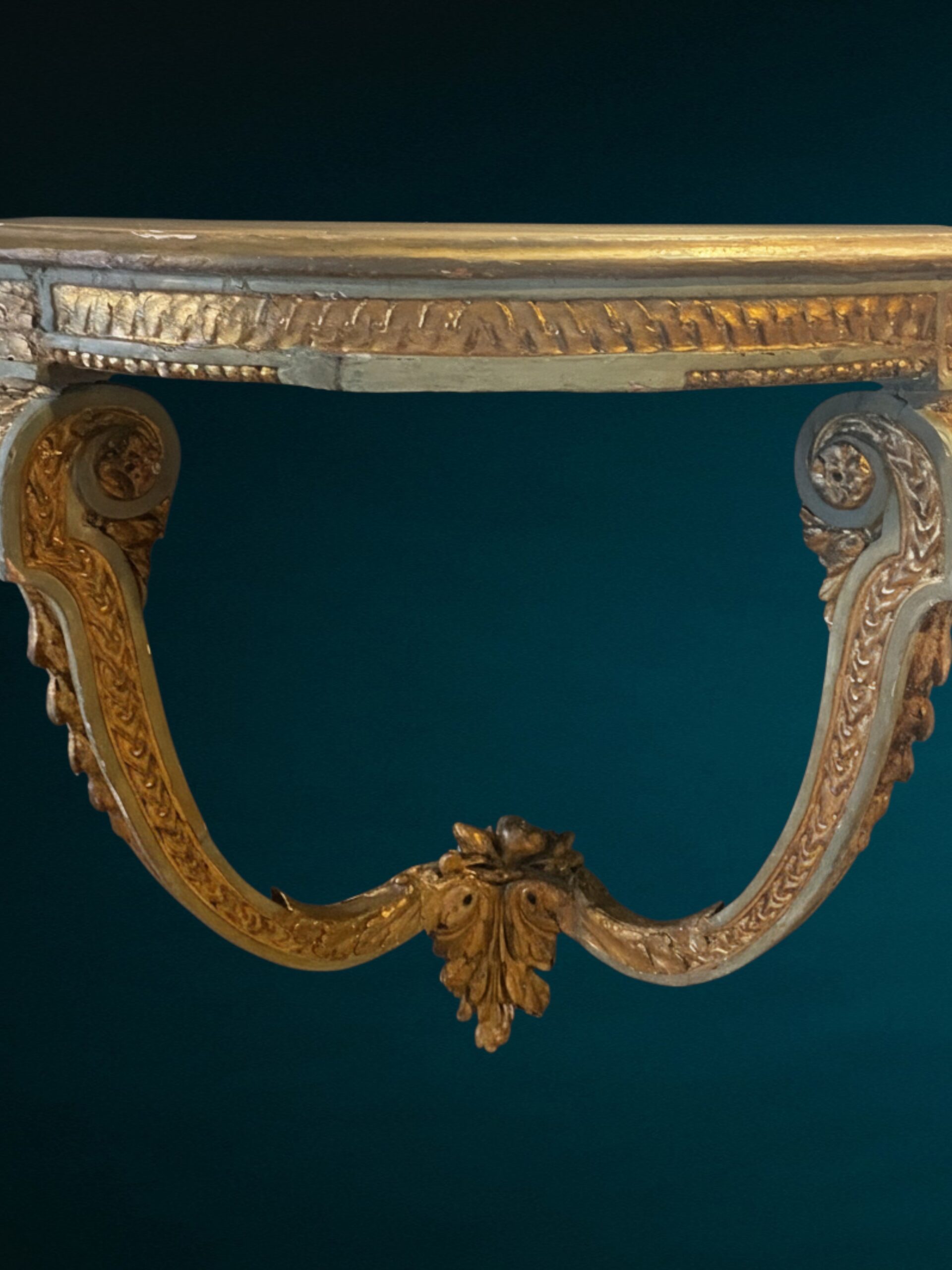 Élégante console ancienne en bois sculpté et doré, datable du XVIIIe siècle, provenant de la même collection privée (château provençal) que le miroir auquel elle est associée, formant un ensemble harmonieux et cohérent.