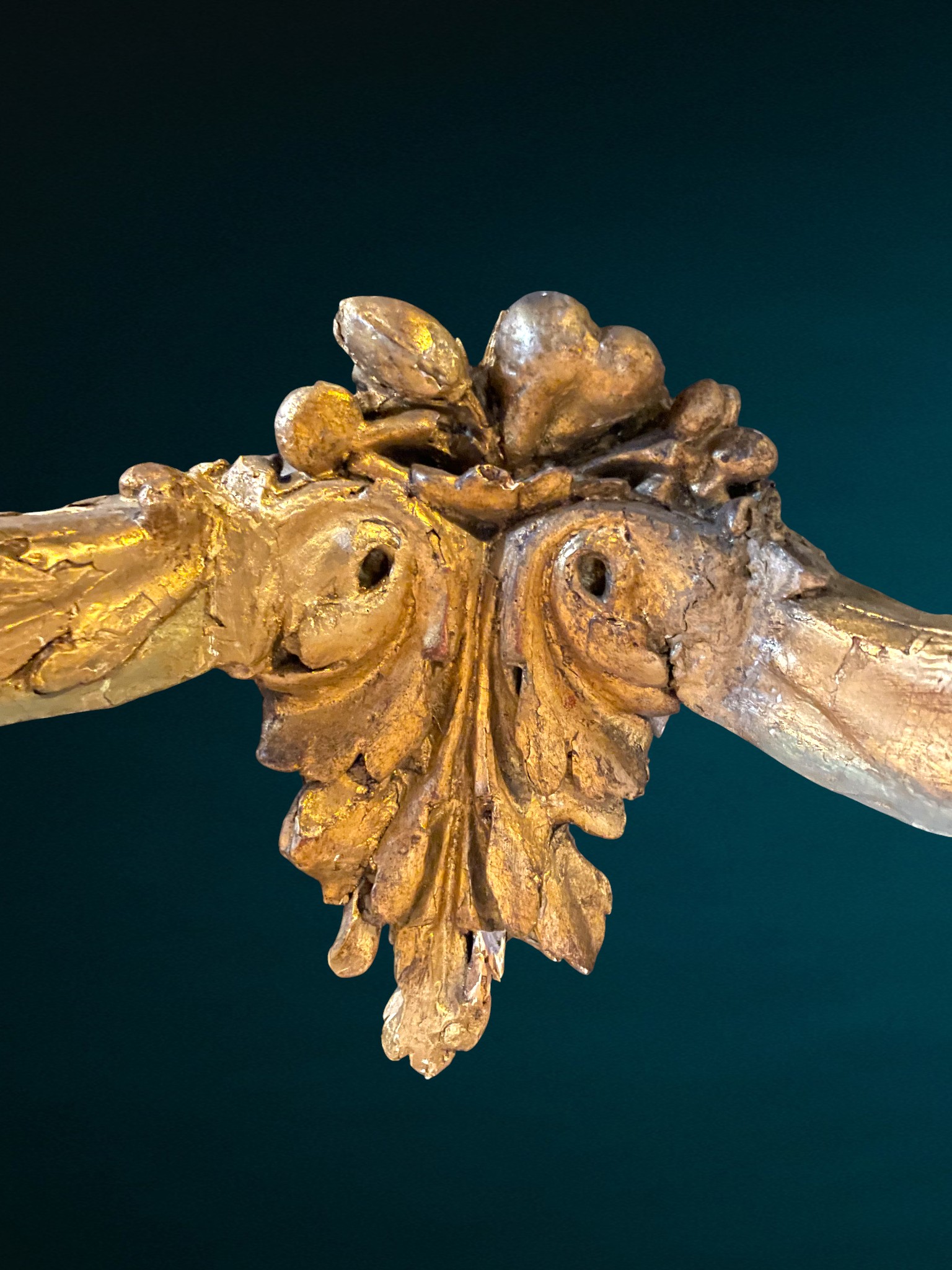 La dorure ancienne à la feuille, d’époque, conserve une patine chaude et nuancée, avec des usures et petits manques conformes à l’âge, participant pleinement à l’authenticité et au charme de la pièce. L’ensemble témoigne d’un travail décoratif soigné, destiné à un intérieur de qualité.