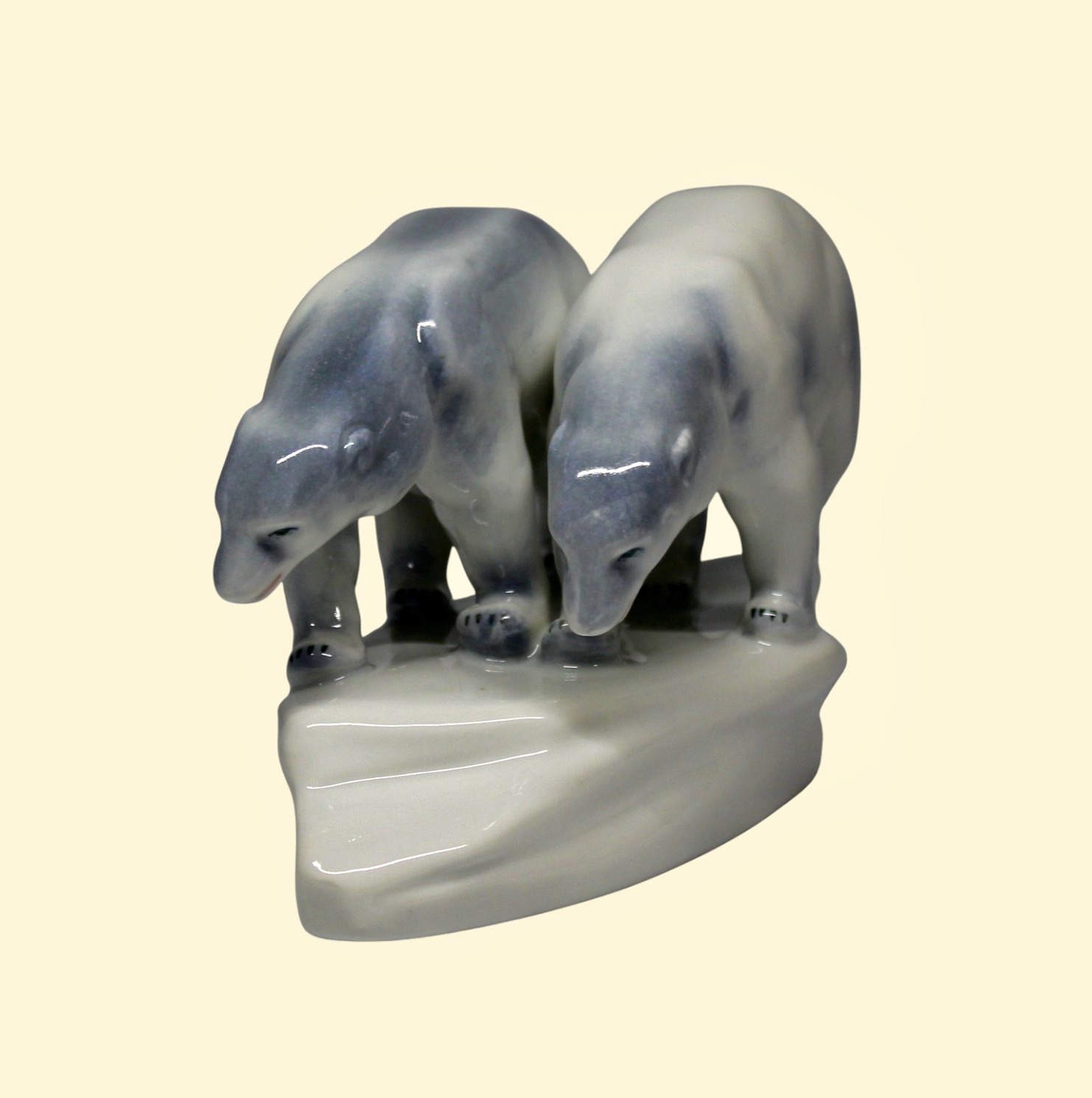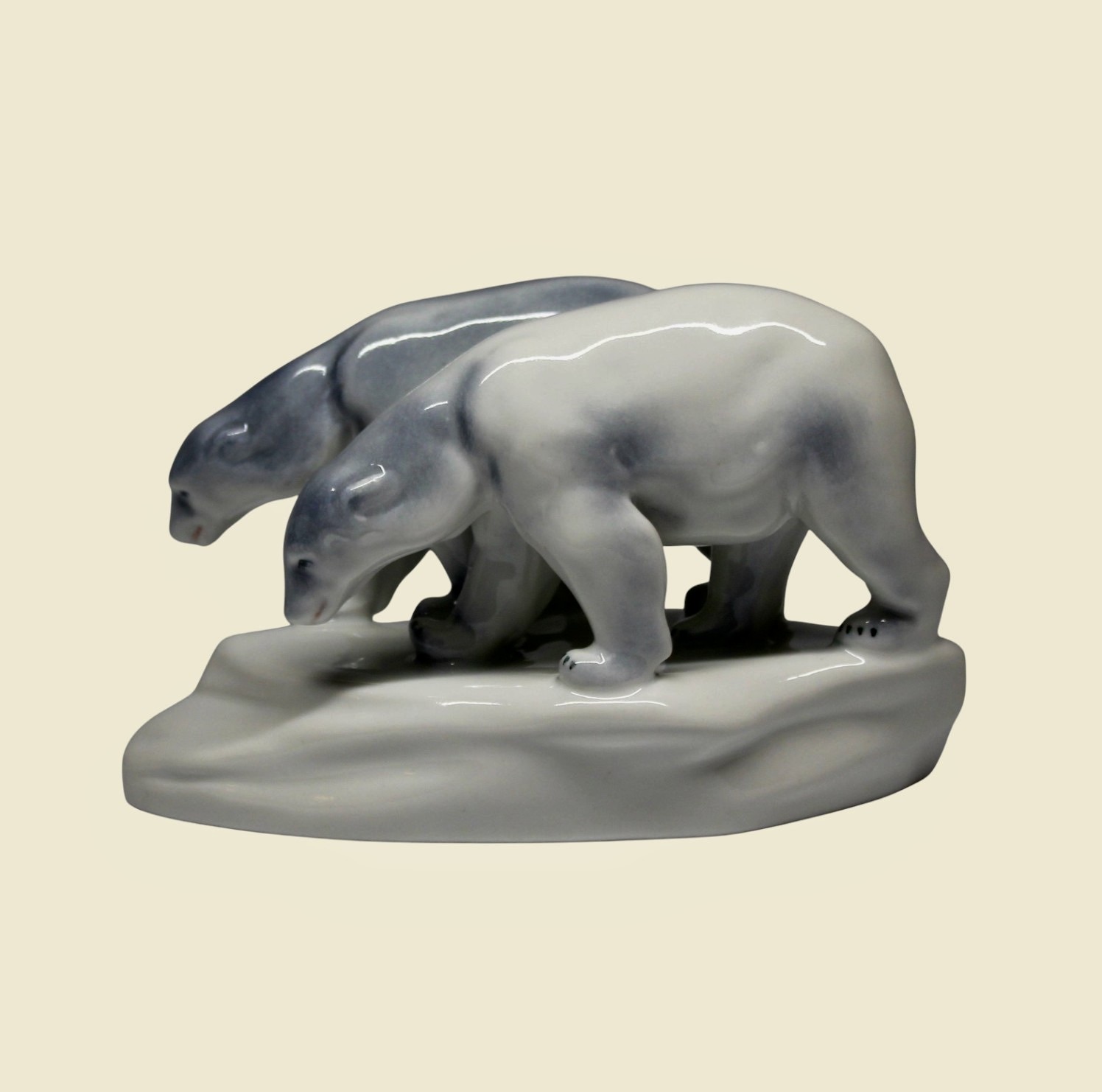 Belle et rare figurine représentant deux ours polaires, réalisée en porcelaine émaillée et peinte à la main, dans un style Art déco sobre et élégant.