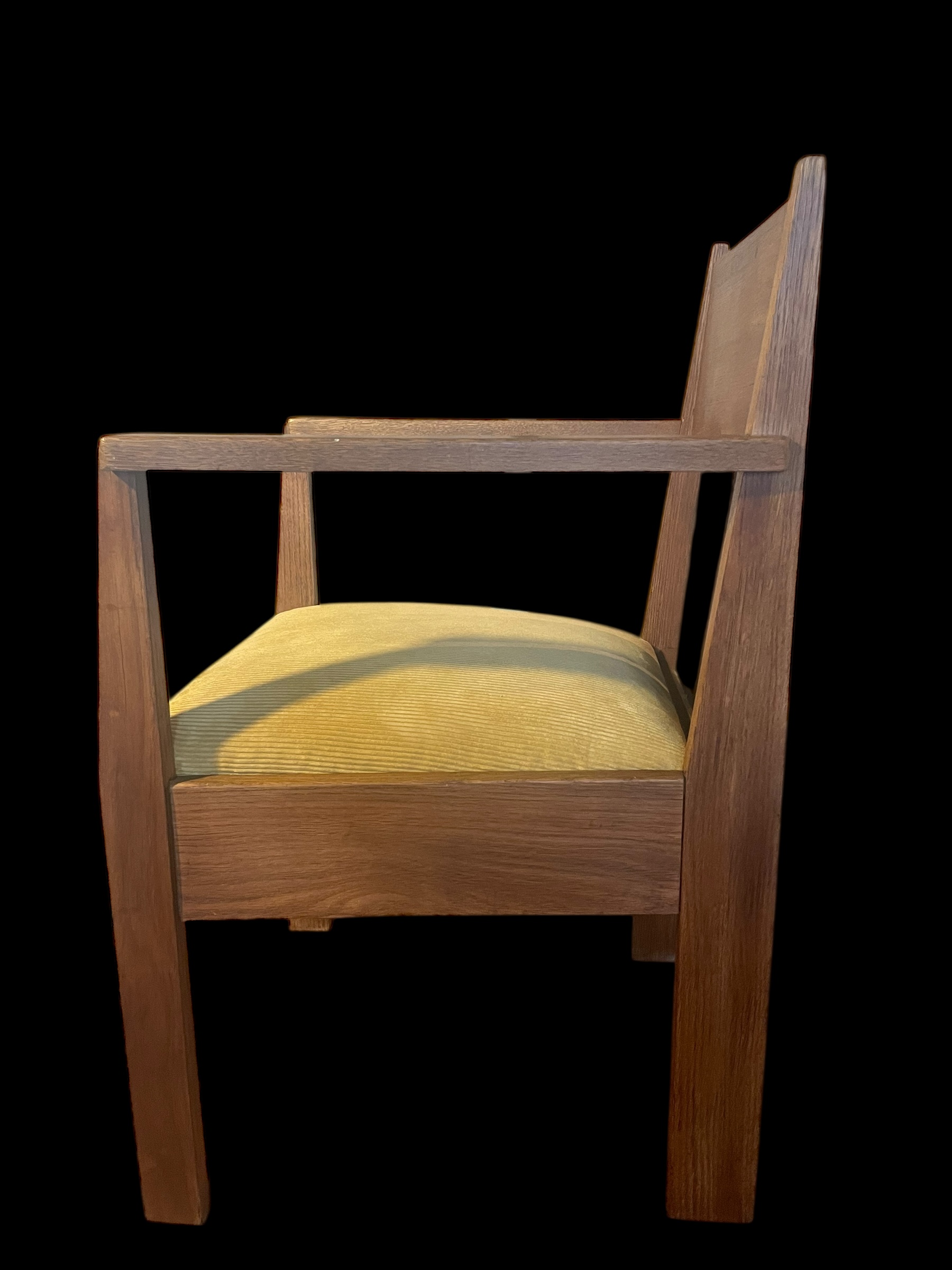 Fauteuil moderniste en chêne massif, édité et estampillé par la manufacture néerlandaise Meubelabriek L.O.V., figure représentative du design hollandais des années 1950.