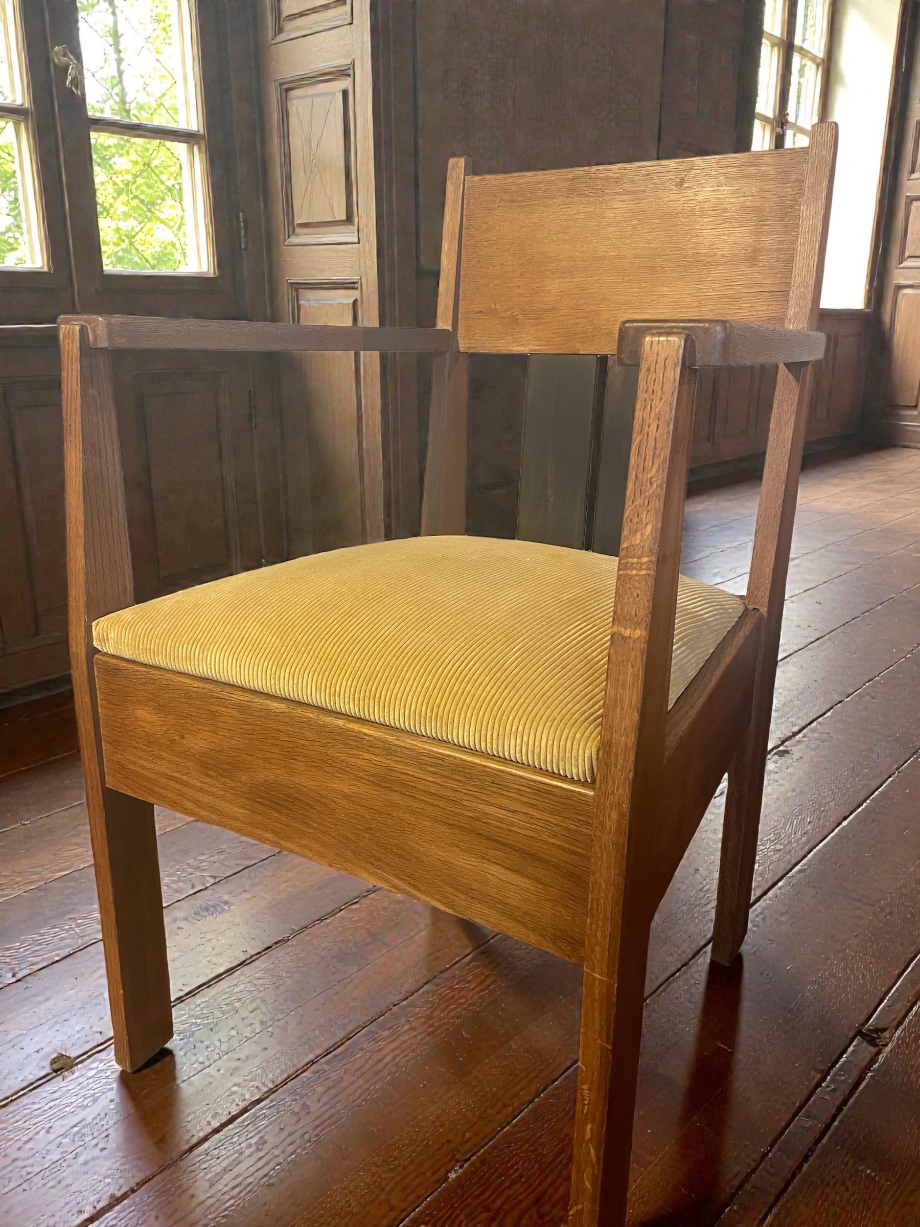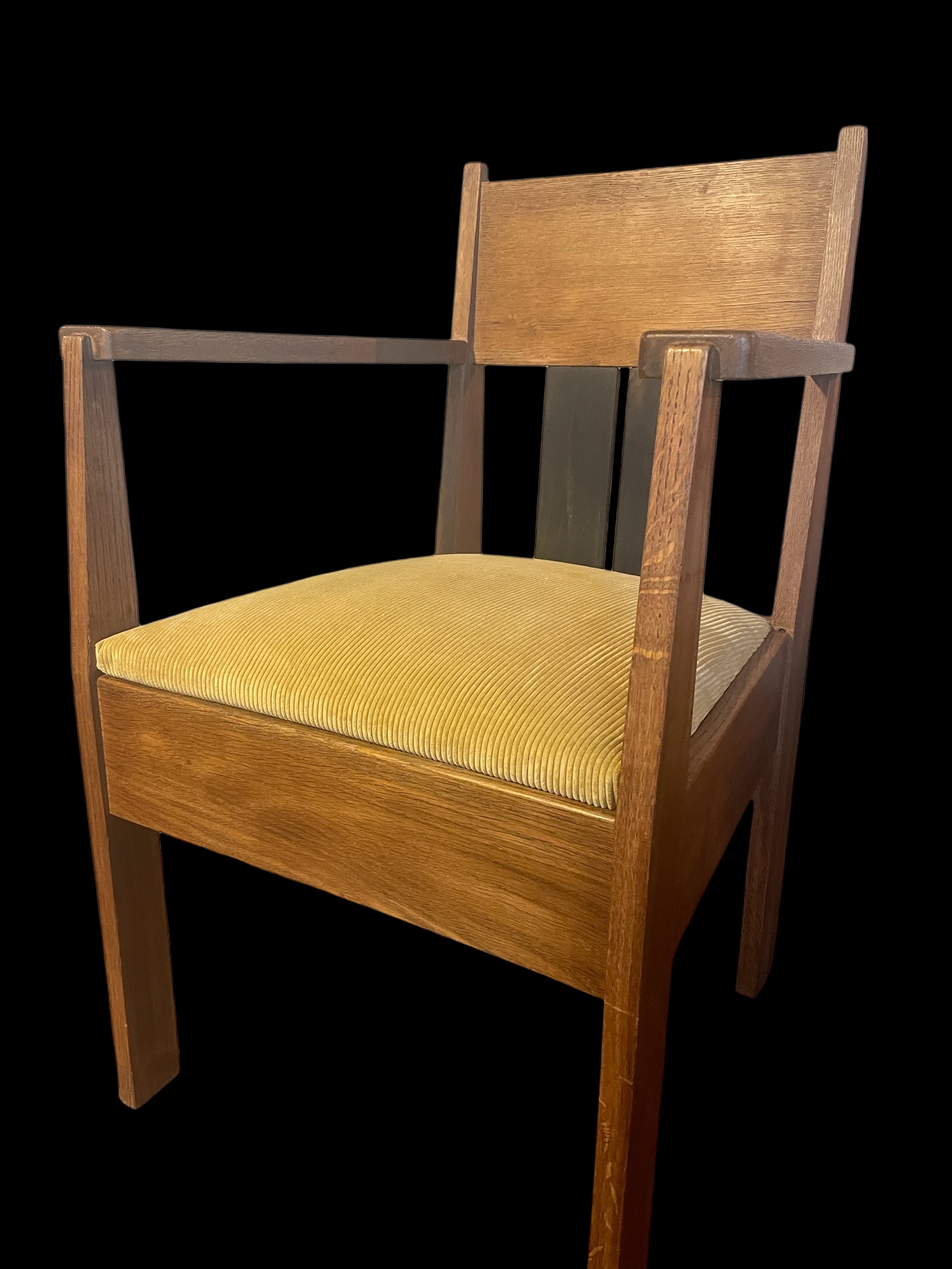 Le chêne présente une belle patine d’origine, chaleureuse et homogène, témoignant de l’âge du fauteuil sans altérer sa présence ni sa solidité. L’ensemble est en très bon état général, stable, sain et parfaitement prêt à l’usage.