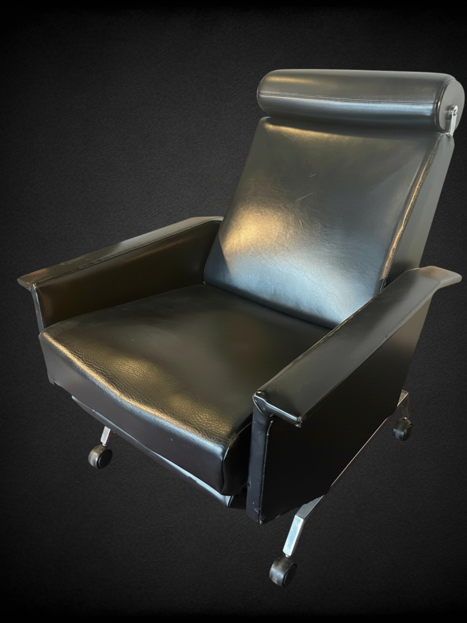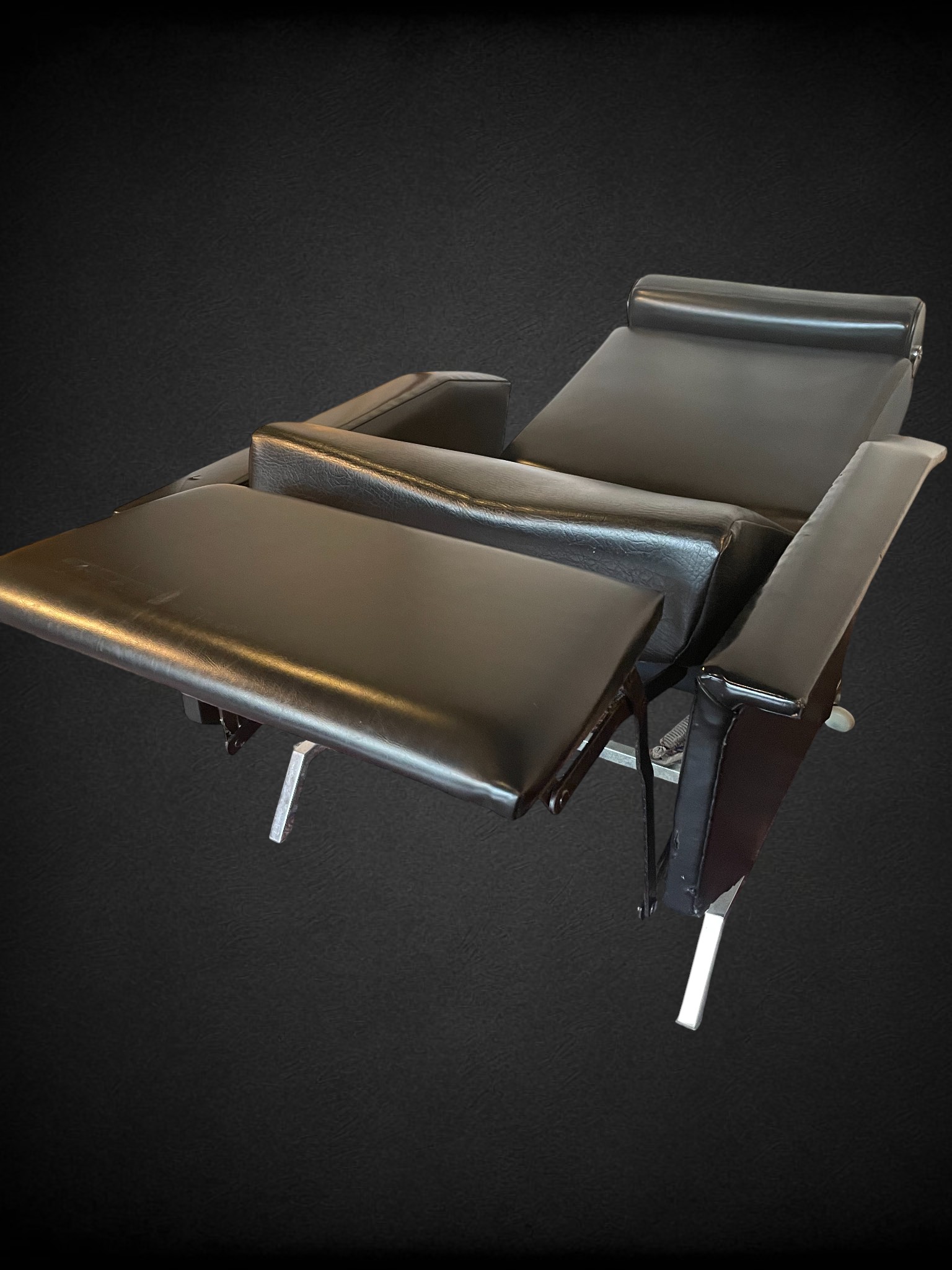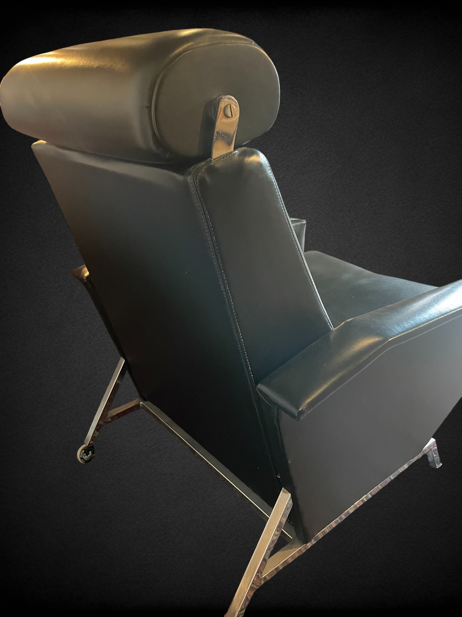 Ce modèle se distingue par une ligne sculpturale et tendue, caractéristique du design moderniste des sixties. La structure en métal chromé dessine une silhouette fluide et dynamique, tandis que l’assise et le dossier en skaï noir apportent sobriété, élégance et contraste. L’ensemble évoque une esthétique à la fois fonctionnelle et expressive, typique du mobilier de détente de cette période.