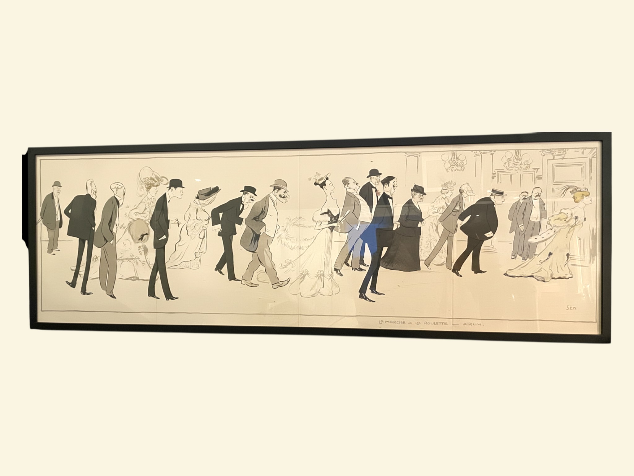 Important tirage panoramique représentant une scène mondaine animée, caractéristique de l’univers satirique et élégant de SEM, chroniqueur graphique majeur de la société parisienne du premier tiers du XXᵉ siècle.