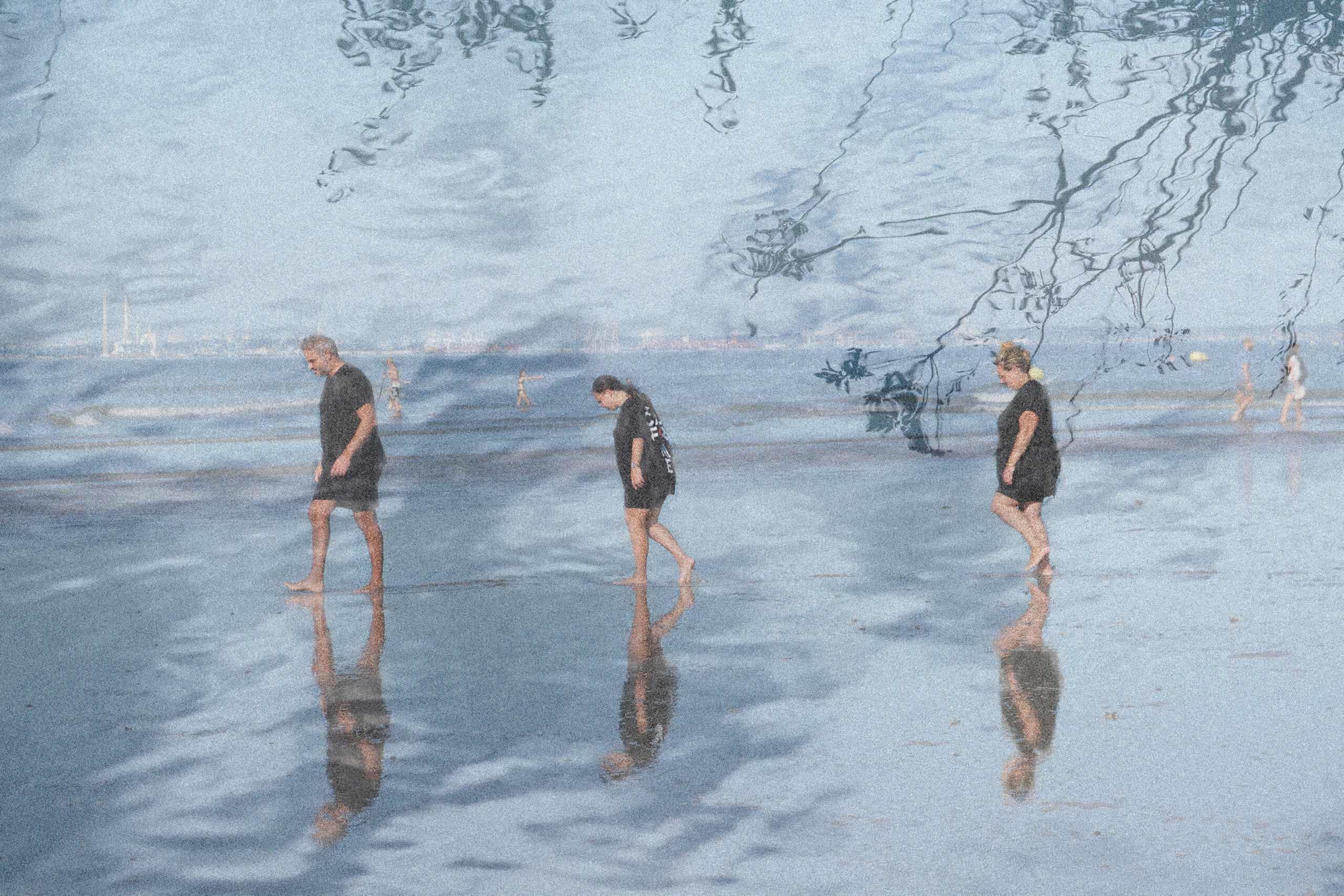 Trois silhouettes avancent lentement sur le sable humide, leurs pas reflétés dans une surface miroitante. La mer se confond avec le ciel dans une lumière douce, presque laiteuse. Un voile translucide semble se superposer à la scène, comme une mémoire qui affleure ou un paysage qui se dissout.
