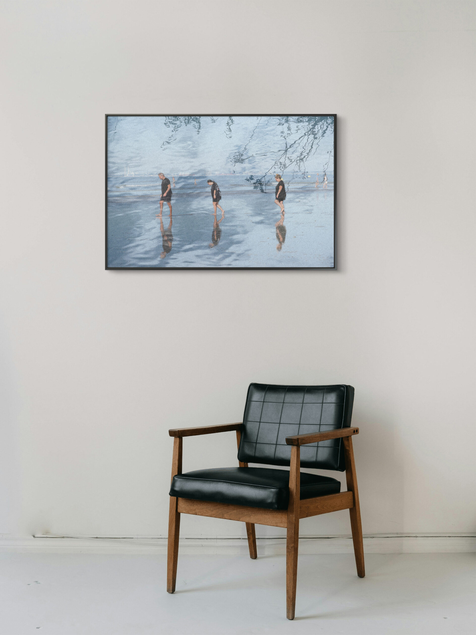 Les corps, sombres et simples, progressent dans le même mouvement, chacun pourtant absorbé dans sa propre intériorité. Les reflets prolongent les figures, créant un double fragile, presque onirique. La réalité paraît filtrée, transformée par une matière subtile qui donne à l’image une dimension picturale.