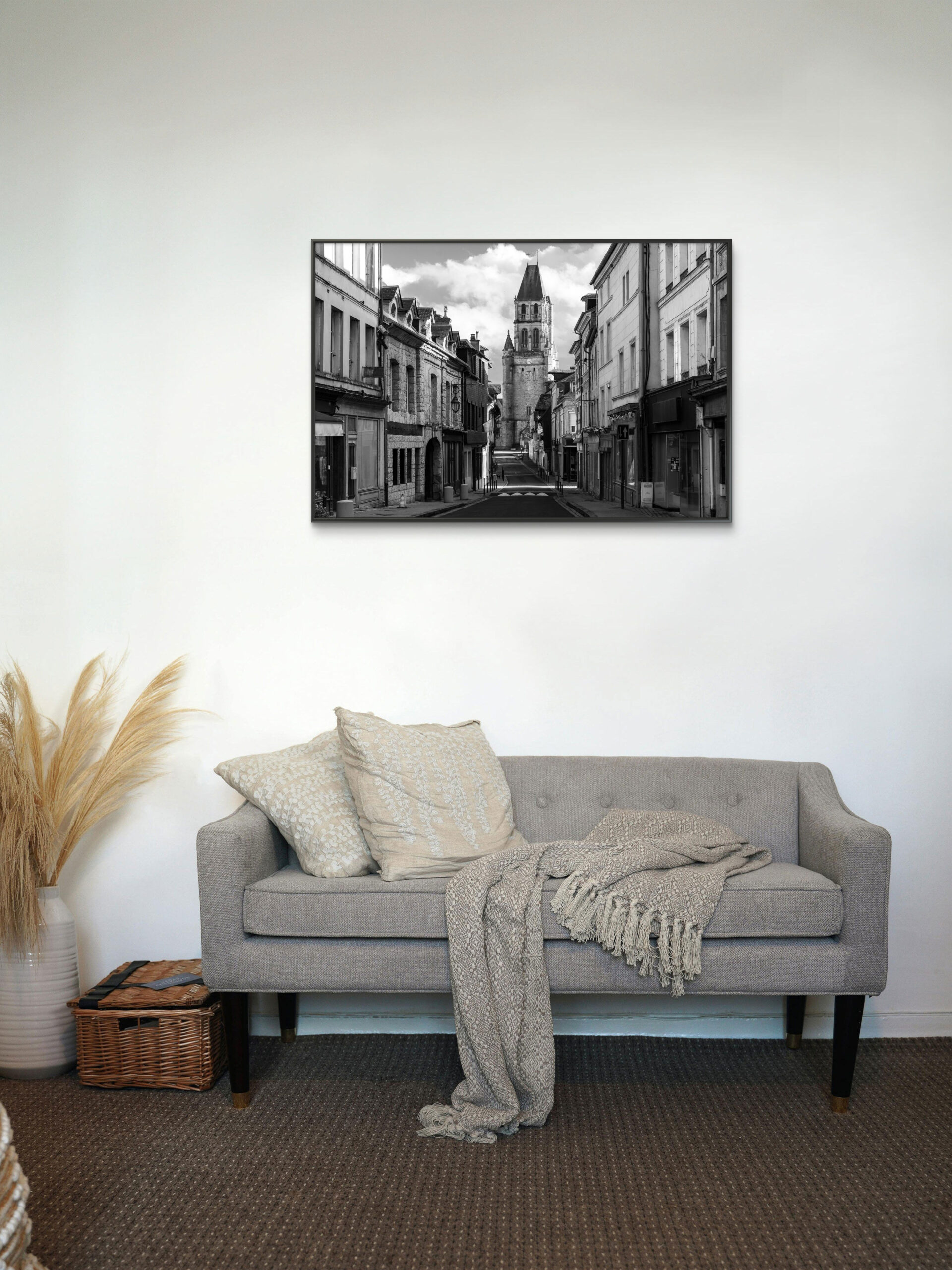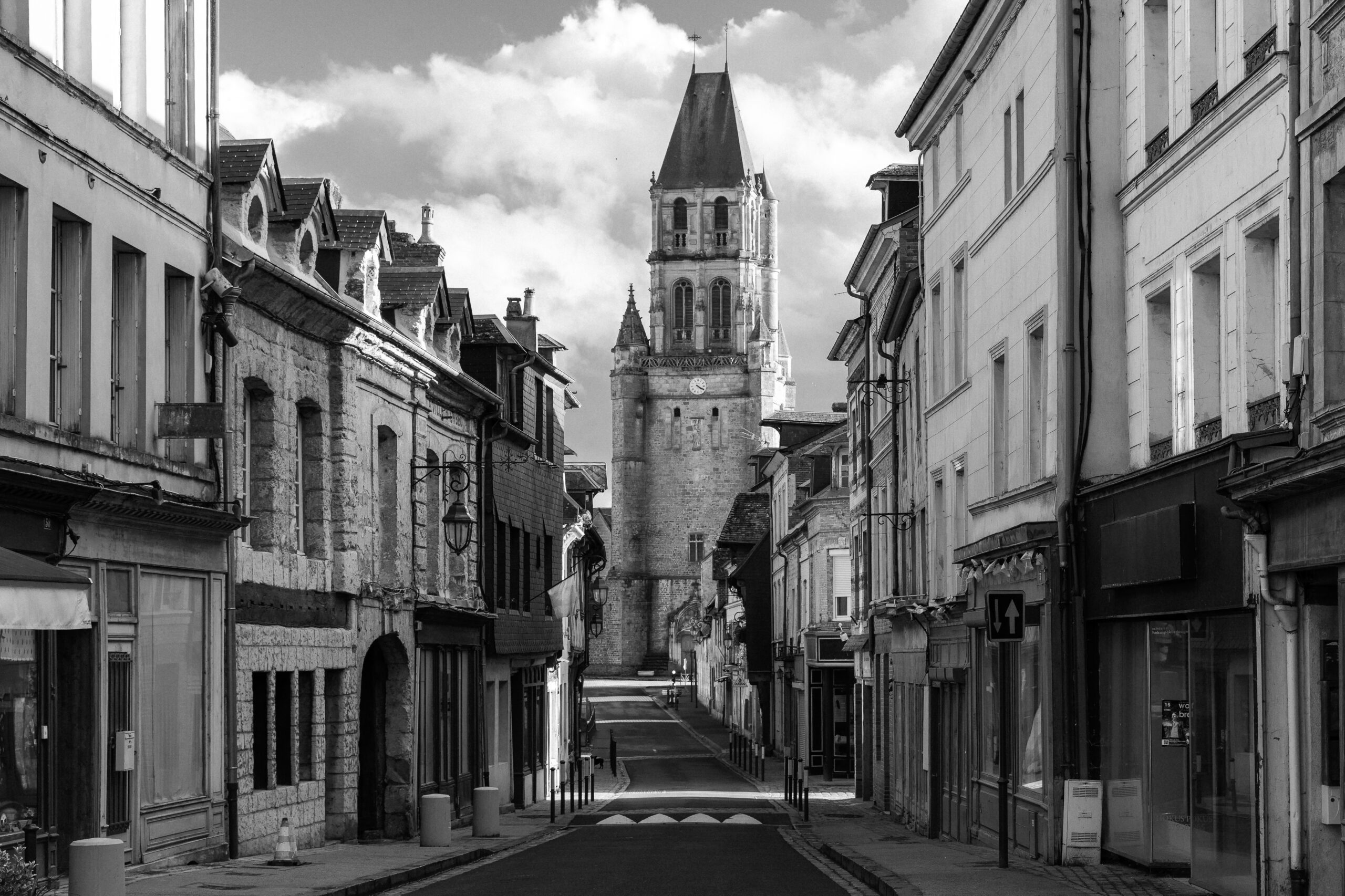 La rue s’étire vers le clocher qui domine la perspective. Les façades anciennes, de pierre et d’enduit, encadrent la scène avec rigueur et profondeur. En noir et blanc, les matières se révèlent : aspérités des murs, lignes des toitures, ombres portées qui structurent l’espace.