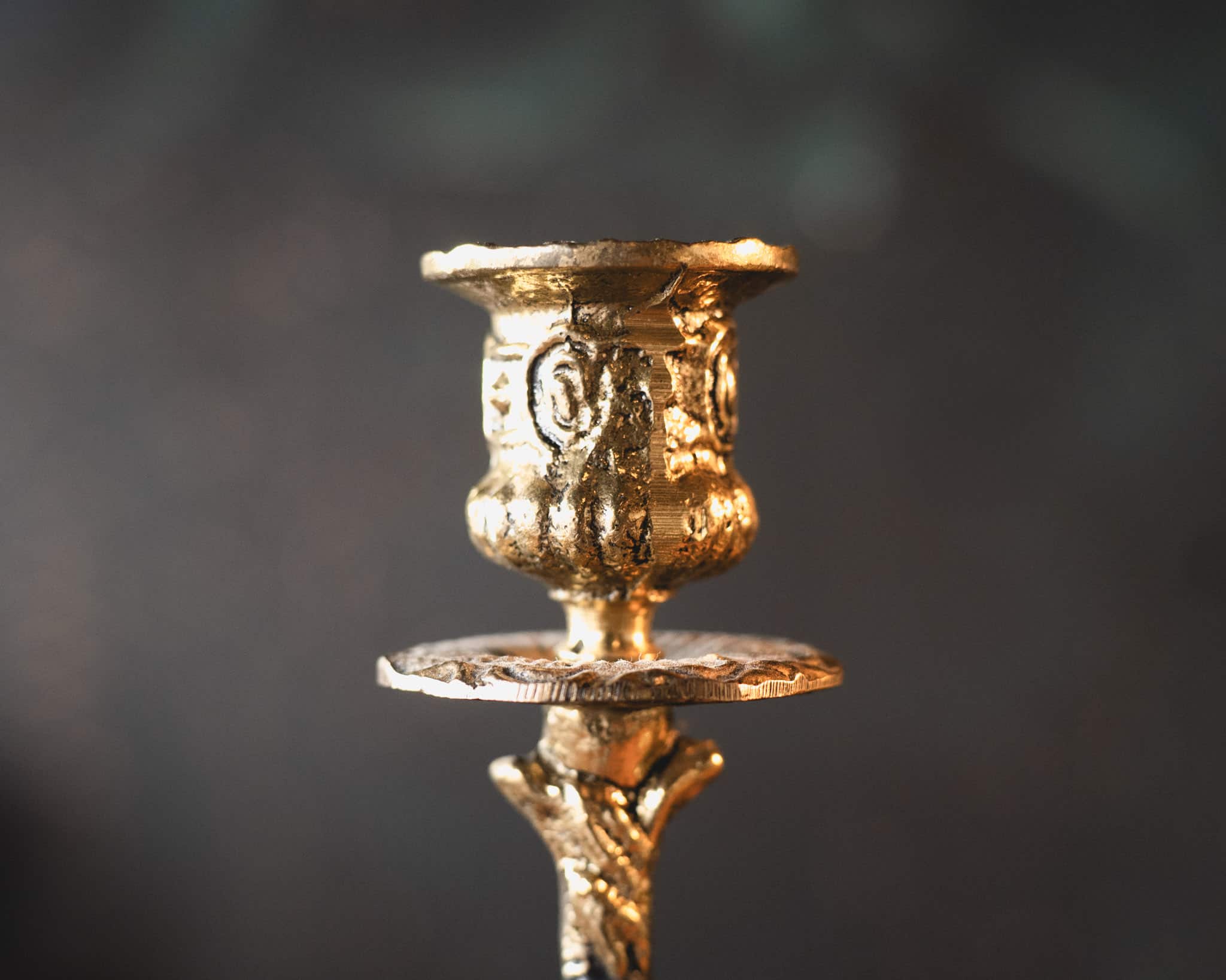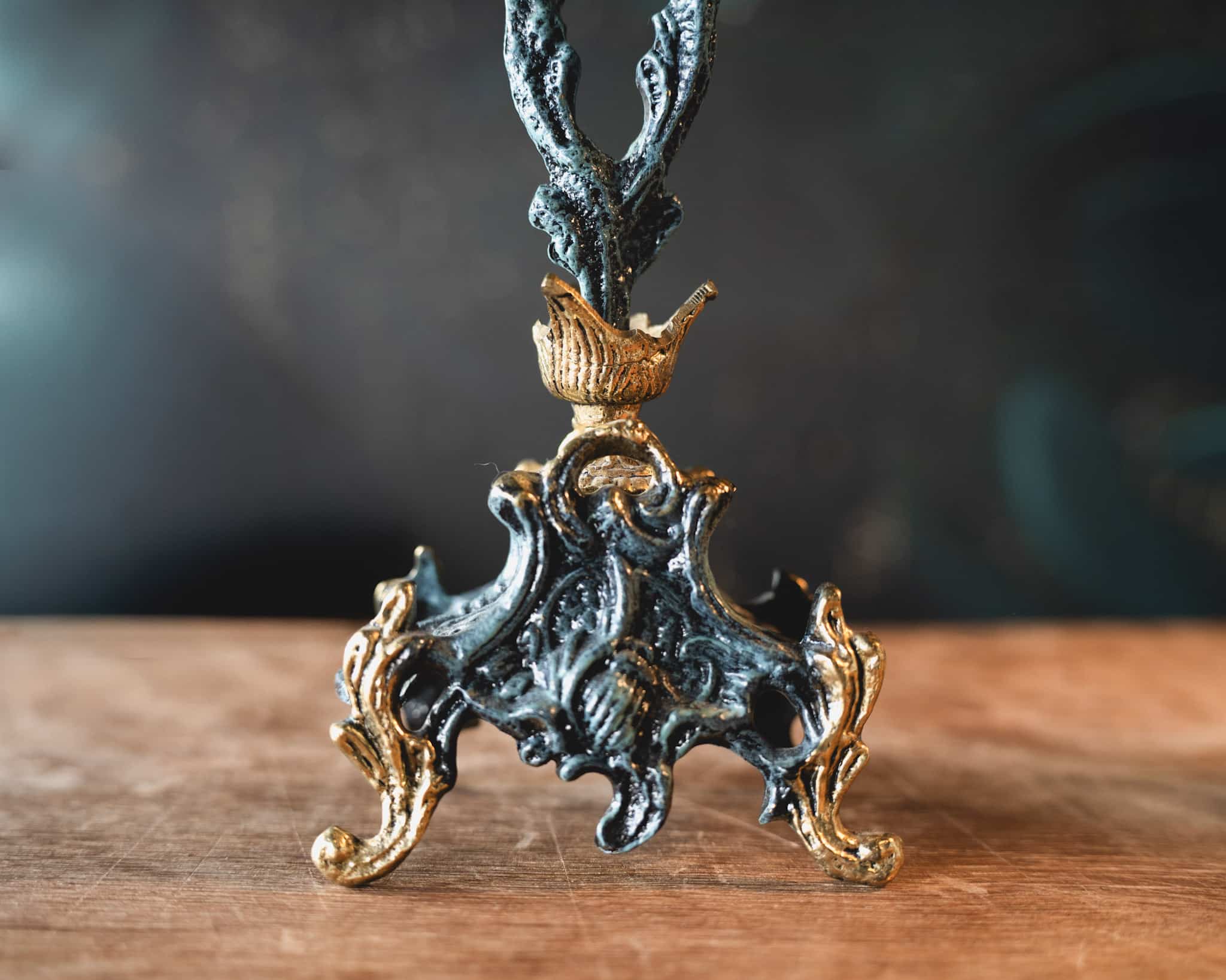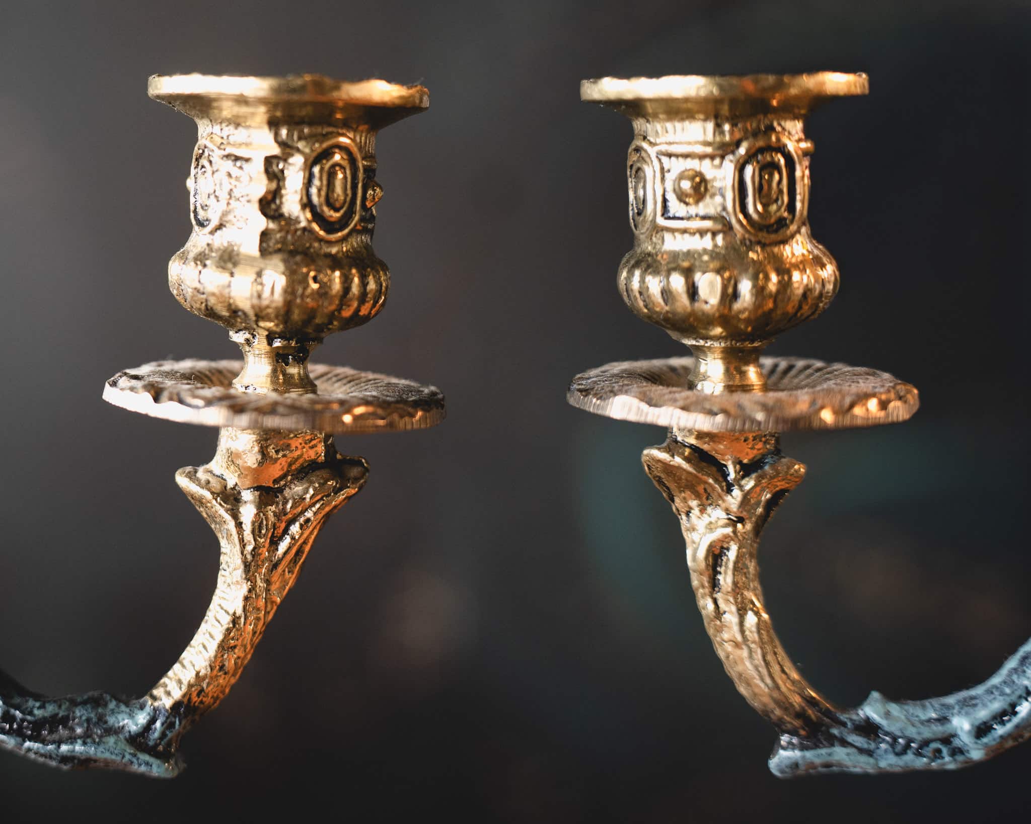 Les candélabres présentent trois bras de lumière et reposent sur un socle richement travaillé et incurvé. La combinaison de la dorure chaude et de la patine bleu-vert leur confère un charme ancien et un caractère décoratif fort.
