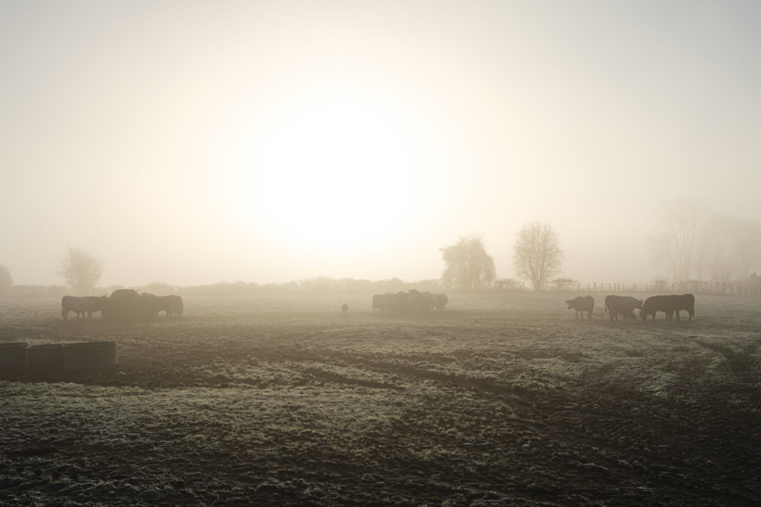 La lumière naissante traverse un voile de brume et enveloppe le paysage d’une clarté dorée. Le sol, givré, retient encore la nuit. À l’horizon, quelques arbres se devinent en silhouettes diffuses, tandis qu’un troupeau immobile occupe l’espace avec une présence calme et dense.