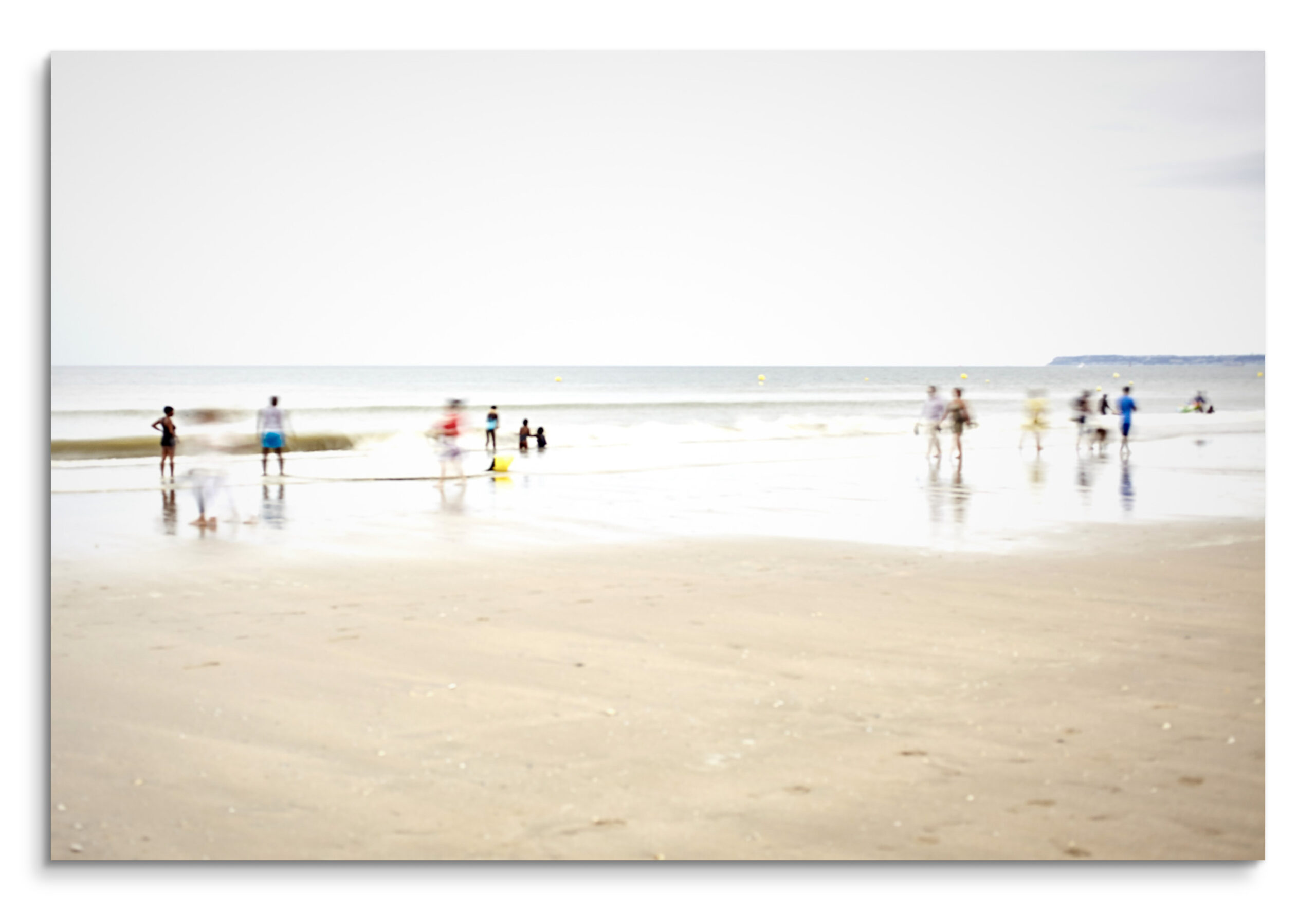 La composition repose sur l’équilibre entre fixité et dissolution. Le sable reflète subtilement les présences, tandis que le flou crée une sensation de respiration, presque musicale. La scène évoque l’éphémère, la fragilité des instants d’été, la mémoire qui s’estompe à mesure qu’elle se forme.