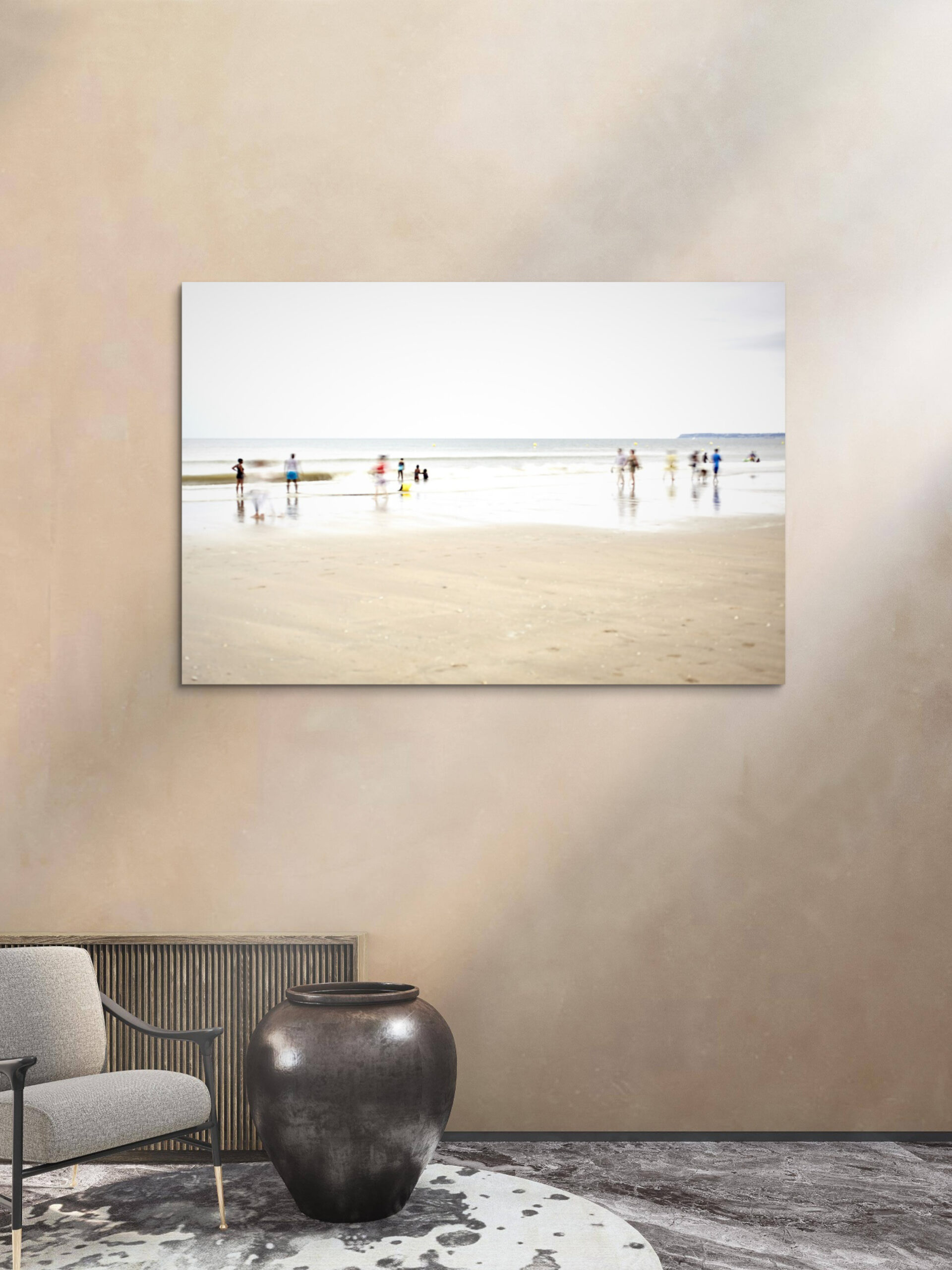 La mer se retire doucement, laissant une vaste étendue de sable humide où les silhouettes se déplacent comme des apparitions. Saisies en pose longue, les figures se brouillent, se dématérialisent, deviennent traces lumineuses plutôt que corps définis.